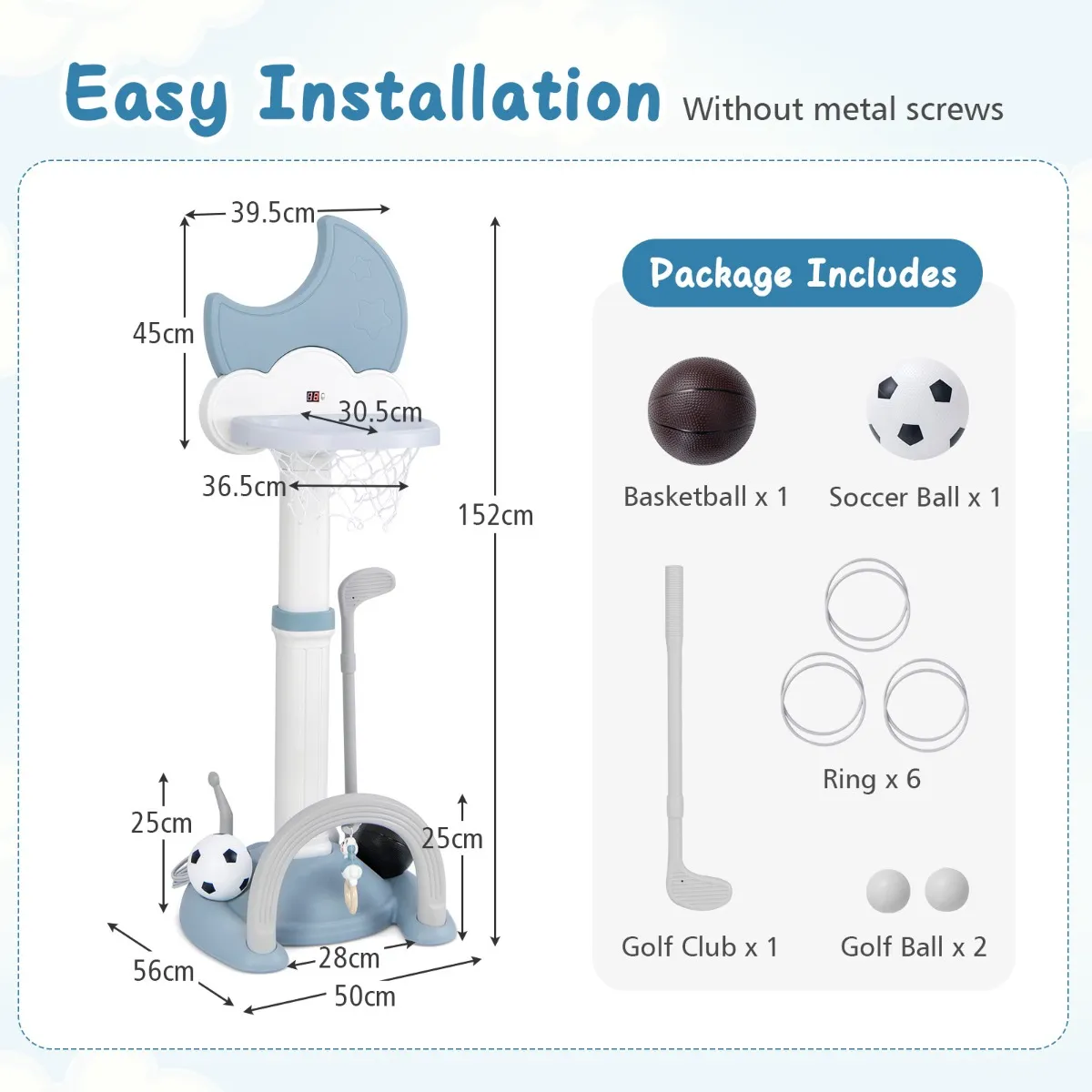 Met basketbal, voetbal, golf en hoepelwerpen biedt deze peutervriendelijke faciliteit eindeloos plezier in één compact pakket. De in hoogte verstelbare basketbalring groeit met je kind mee, zodat kinderen van alle leeftijden en groottes plezier kunnen blijven beleven. De verzwaarde basis zorgt voor stabiliteit tijdens het spelen. Dit veelzijdige spel is een perfect cadeau om lichaamsbeweging aan te moedigen en schermtijd te verminderen, terwijl het de ontwikkeling en het plezier van je kind bevordert.