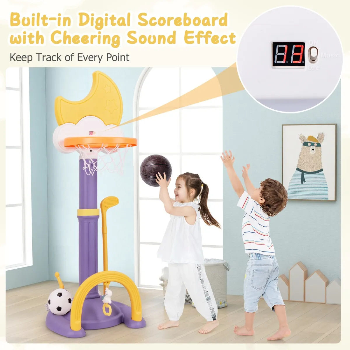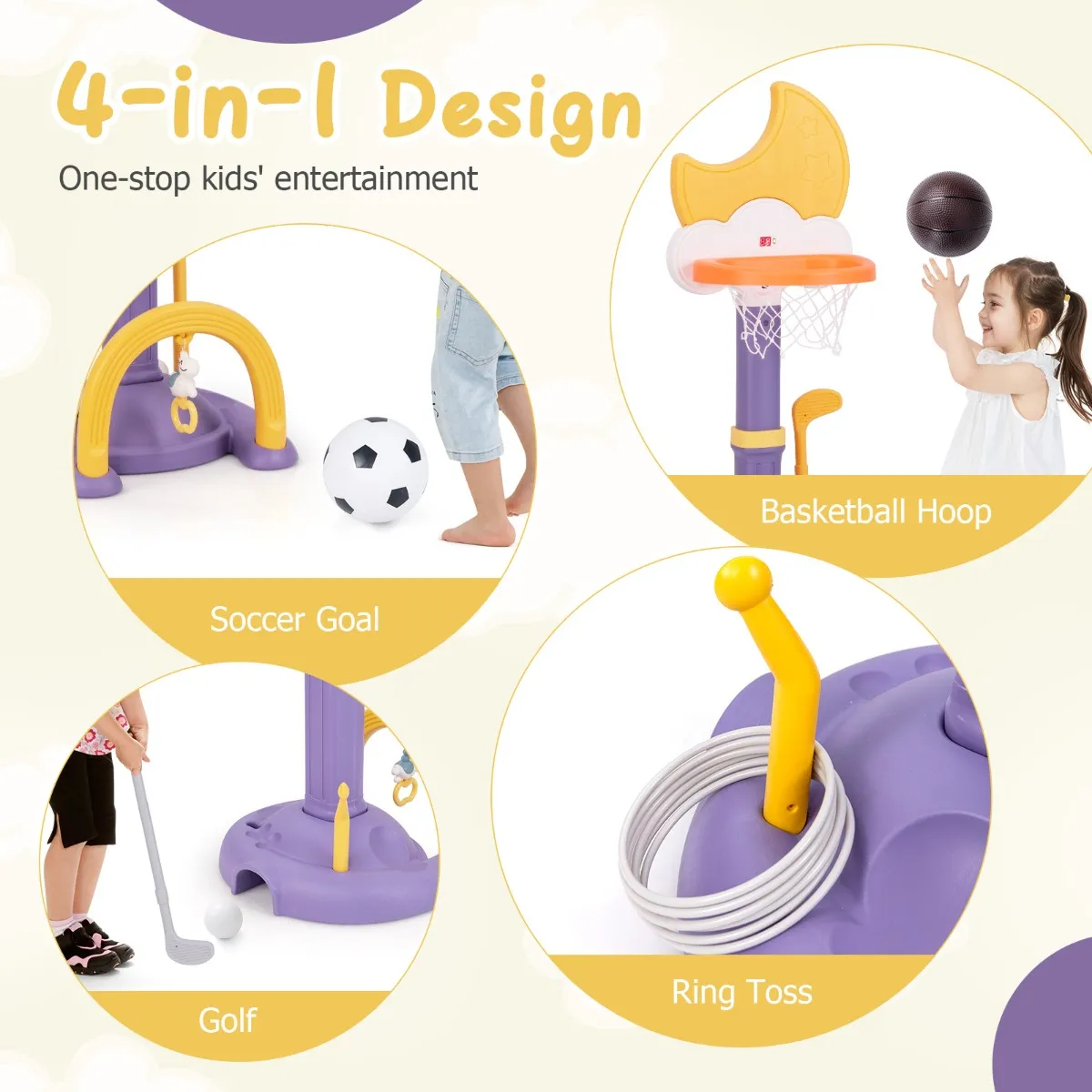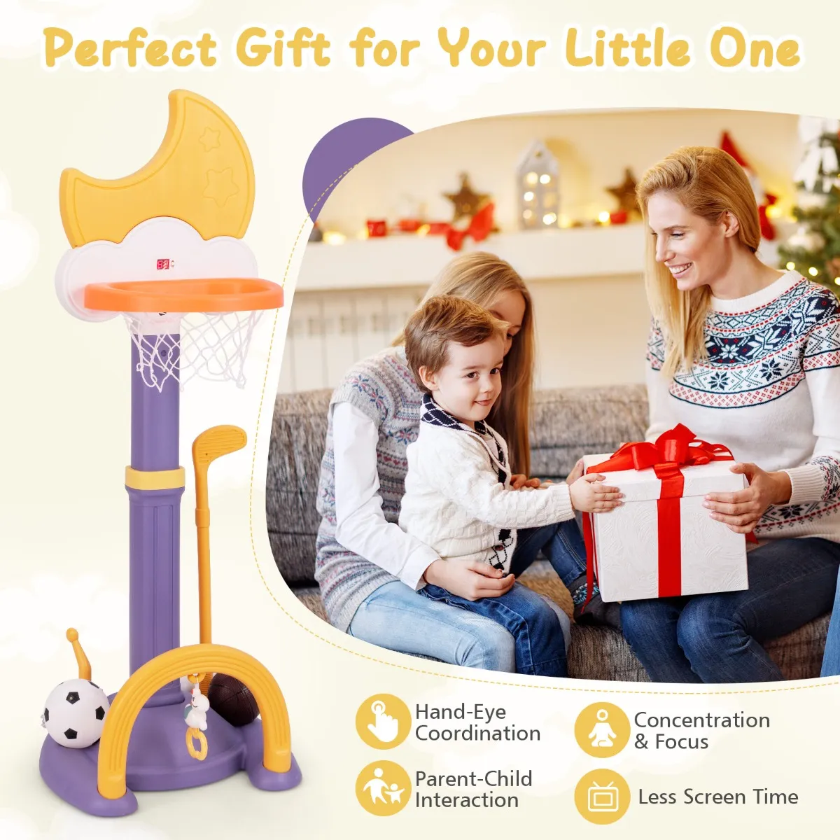Met basketbal, voetbal, golf en hoepelwerpen biedt deze peutervriendelijke faciliteit eindeloos plezier in één compact pakket. De in hoogte verstelbare basketbalring groeit met je kind mee, zodat kinderen van alle leeftijden en groottes plezier kunnen blijven beleven. De verzwaarde basis zorgt voor stabiliteit tijdens het spelen. Dit veelzijdige spel is een perfect cadeau om lichaamsbeweging aan te moedigen en schermtijd te verminderen, terwijl het de ontwikkeling en het plezier van je kind bevordert.