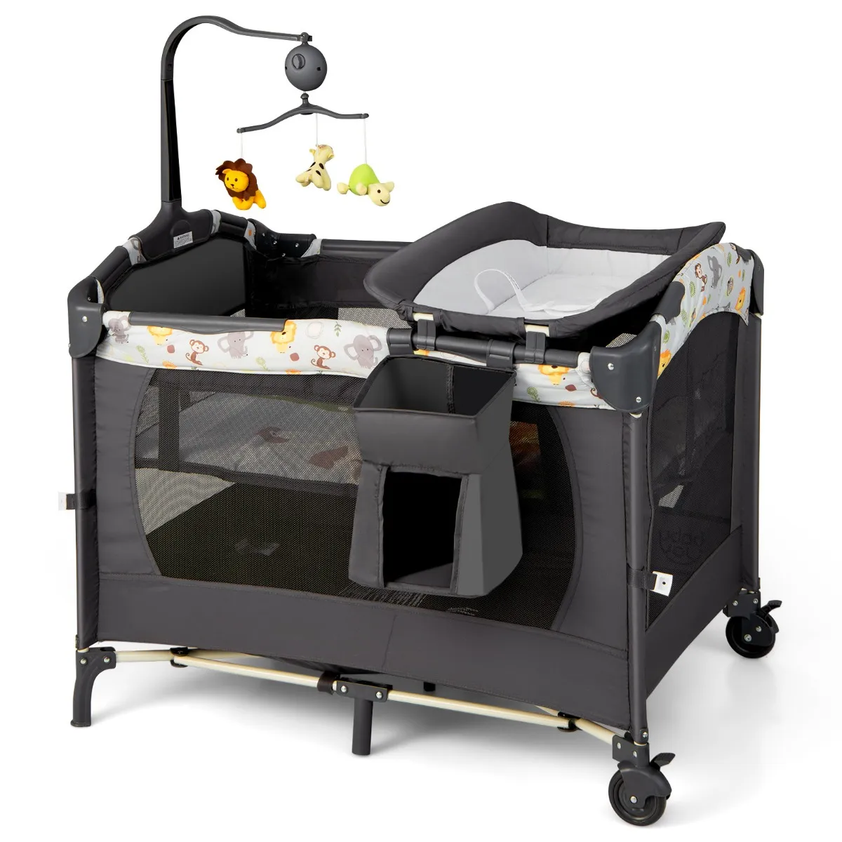 De draagbare babyspeelbox biedt een comfortabele en veilige ruimte voor de baby en is voorzien van een luiertafel, wieg en een activiteitencentrum. Hij dient om de groei van de baby met grote zorg te begeleiden. De speelbox is voorzien van 2 wielen en remmen voor meer stabiliteit. Aan de onderkant zorgt de 7-puntsstructuur voor een sterke ondersteuning, waardoor het een stevigere speelbox wordt. Speciaal ontworpen voor de baby, 3 schattige dierenspeeltjes en een muziekdoosje zorgen voor meer vermaak en maken dat de baby rustig in slaap valt. Neem de babyspeelbox mee naar huis, en laat hem je baby begeleiden van pasgeborene tot peuter.
