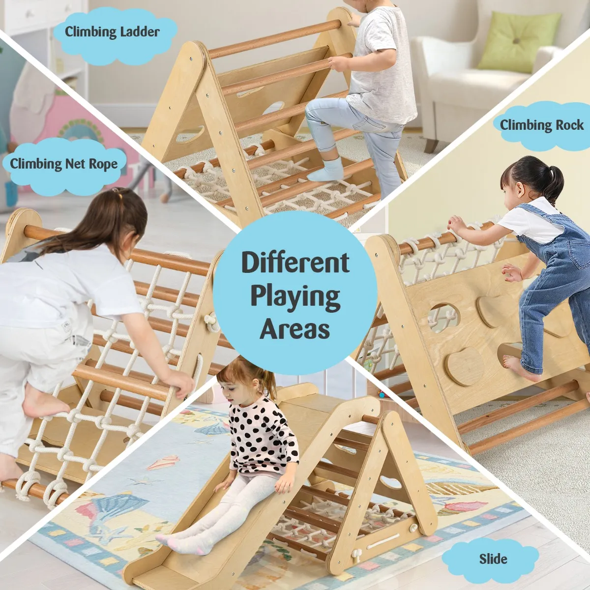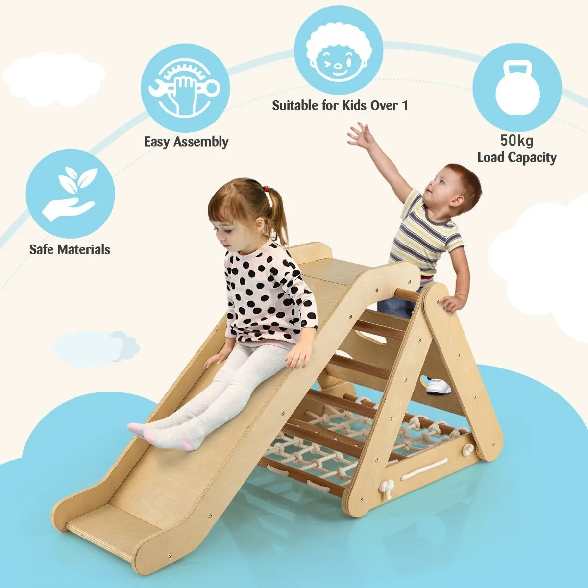 ÂDriezijdig klimrek met helling: Het driehoekige klimrek heeft een klimladder, een klimplank en een sterk klimnet, en deze 3 verschillende kanten zorgen voor continu speelplezier voor je kinderen. Bovendien kan dit product worden gebruikt om te glijden met de bijgeleverde helling.