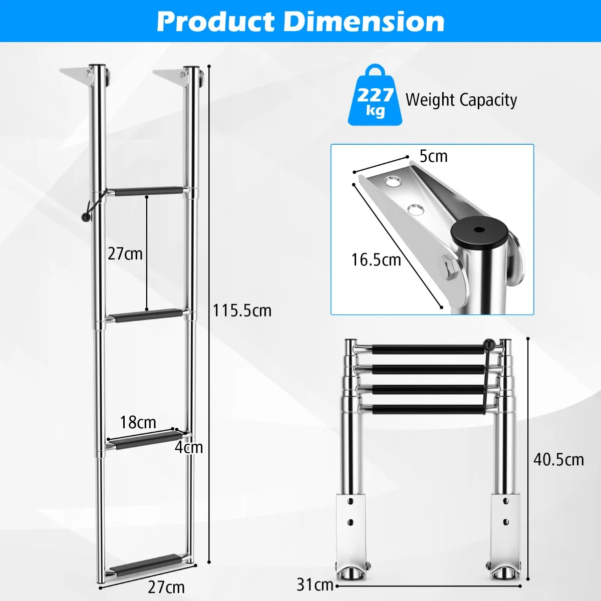 Deze telescopische ladder met 4 treden is gemaakt van roestvrij staal met een spiegelglad oppervlak en kan een gewicht tot 227 kg dragen. Hij heeft 4 secties, waardoor hij kan worden uitgeschoven van 40,5 cm tot 115,5 cm, voor gemakkelijke toegang tot en van je boot. Elke trede is bedekt met duurzaam, antislip PVC, zodat je met een gerust hart aan en van boord kunt gaan. Het opvouwbare en telescopische ontwerp kan compact worden opgeborgen als het niet wordt gebruikt, waardoor je waardevolle ruimte op je boot bespaart.