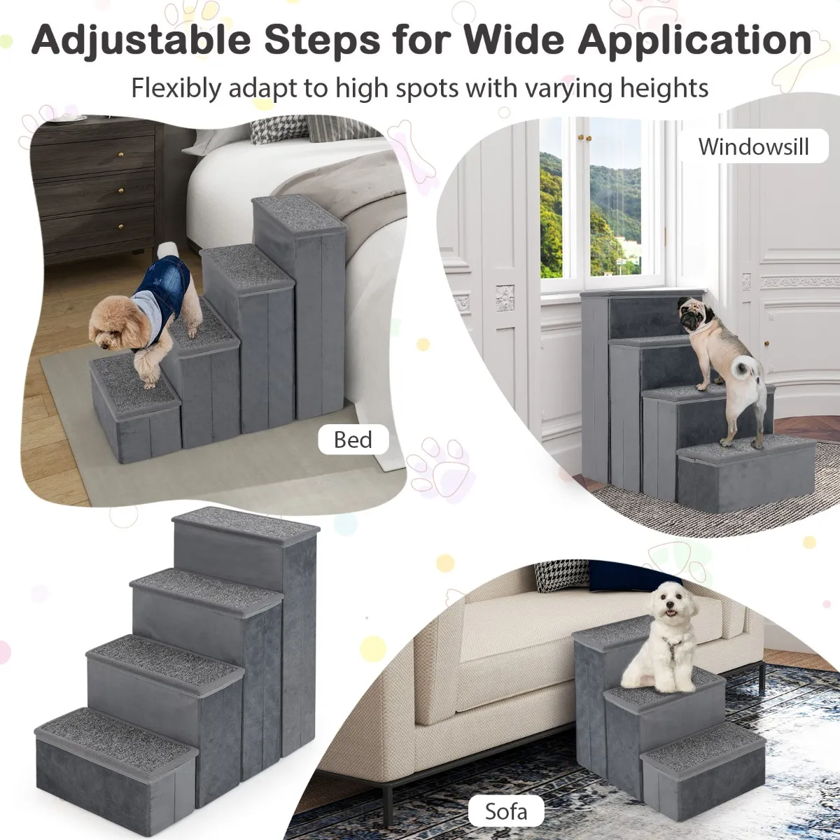 Maak het gemakkelijker voor je huisdier om hoge plekken te bereiken met onze 4-traps hondentrap. Elke stand beschikt over een opbergvak voor belangrijke huisdierartikelen. De opvouwbare trap is ideaal voor kleine ruimtes en eenvoudig op te bergen. De zachte Nederlandse fluwelen hoes is zacht voor de poten. De tapijttreden bieden extra grip, de antislip bodem garandeert veiligheid. Met een draagvermogen van maximaal 50 kg is de trap geschikt voor kleine en middelgrote honden. Eenvoudige montage zonder gereedschap gebeurt in 5 stappen.