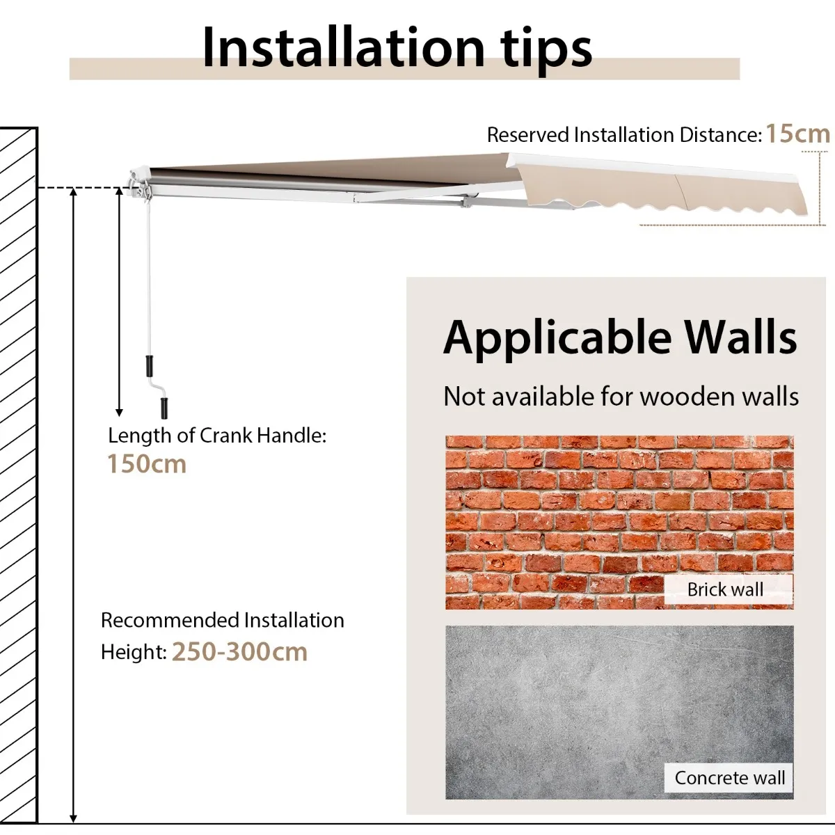 Eenvoudige installatie: Het zonnescherm wordt geleverd met alle benodigde accessoires en een duidelijke handleiding. Let op: enkel geschikt voor montage op betonnen of bakstenen muren – niet op houten muren.