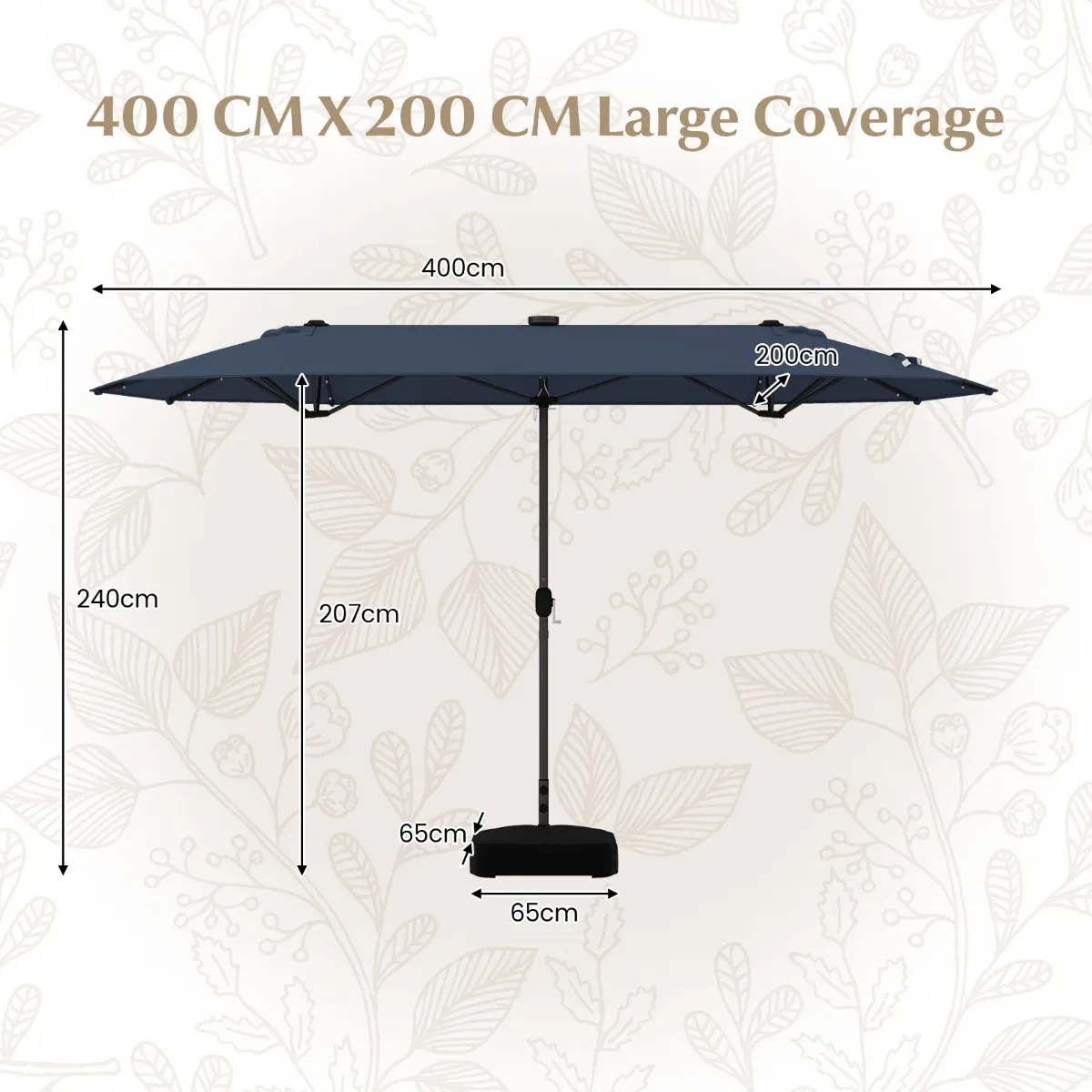 【Grote schaduwruimte】 Met een grote dekking van 400 x 200 cm belooft de dubbelzijdige buitenparasol gemakkelijk uw grootste bijeenkomsten te beschermen. En de parasol met verlichting is uitgerust met ventilatieopeningen om een koel toevluchtsoord te creëren in uw tuin, terras, tuin of bij het zwembad.