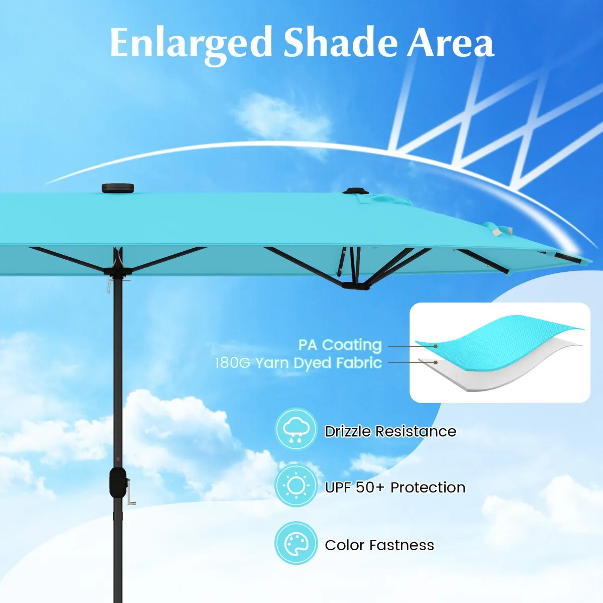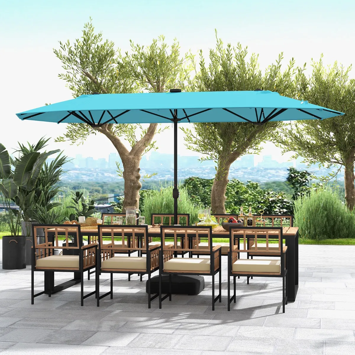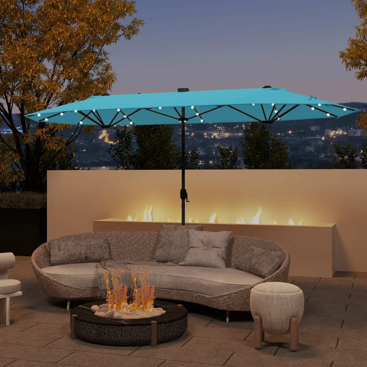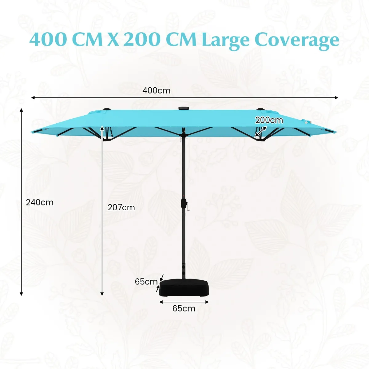 De rechthoekige dubbele parasol van 400 cm met 36 LED-lampjes op zonne-energie kan 8 uur werken op een volle lading. Hij is gemaakt van garengeverfde stof en zal niet vervagen. Gecoat met PA beschermt hij je tegen lichte regen en zonnestralen. Dikke metalen stokken en 12 baleinen zorgen voor stevigheid. De kruisvormige basis kan worden gevuld met 60 kg zand, waardoor hij stabiel genoeg is om wind te weerstaan. Dankzij de slinger kun je hem gemakkelijk openen en sluiten.
