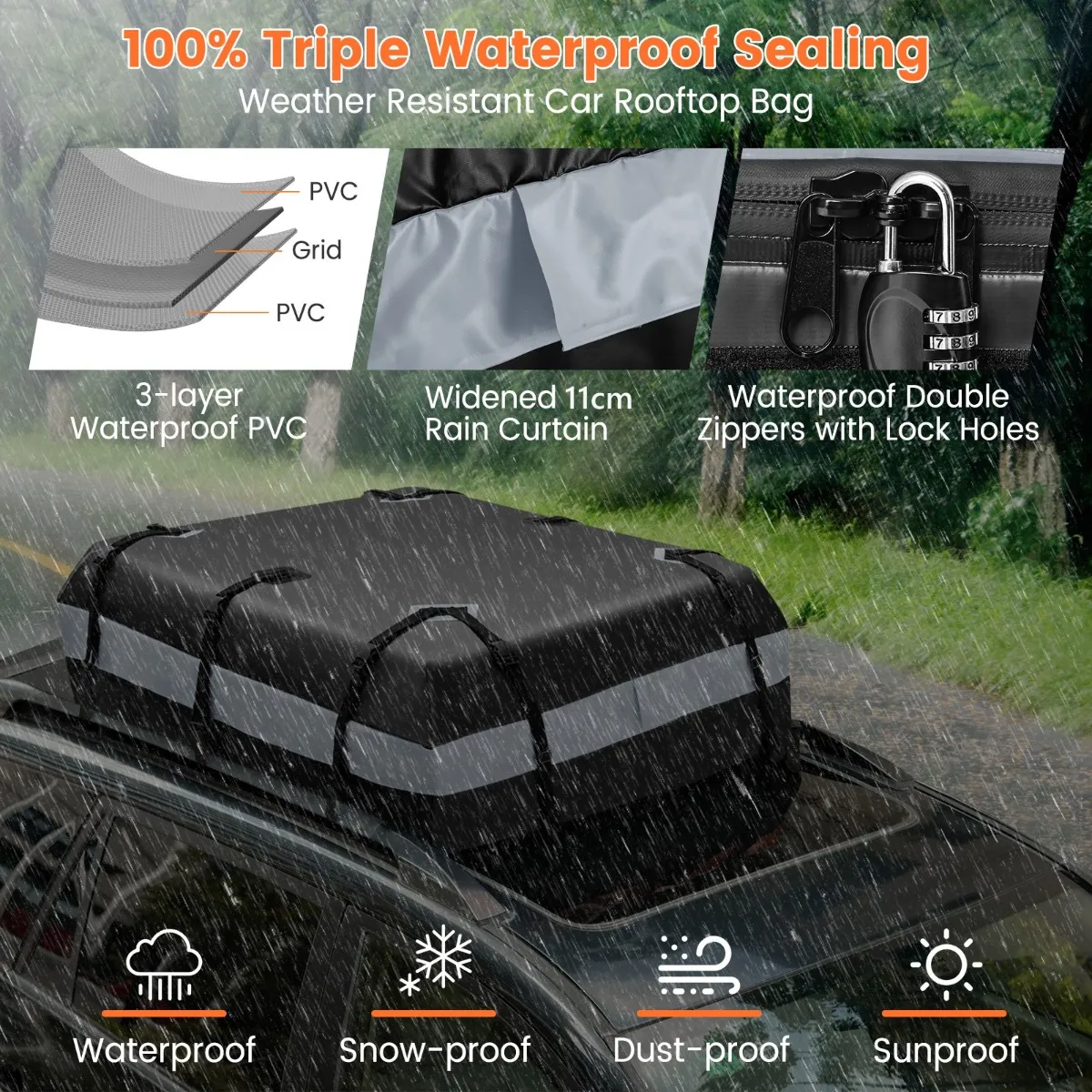 Neem alles wat je nodig hebt mee in onze dakdrager voor een prachtige reis! De daktas is gemaakt van PVC met een hoge dichtheid en drie lagen, waardoor hij zeer goed bestand is tegen slijtage en weersinvloeden. En de waterdichte ritsen worden beschermd door een 11 cm lang regengordijn, zodat je zeker weet dat je spullen intact blijven in nat, besneeuwd of winderig weer.