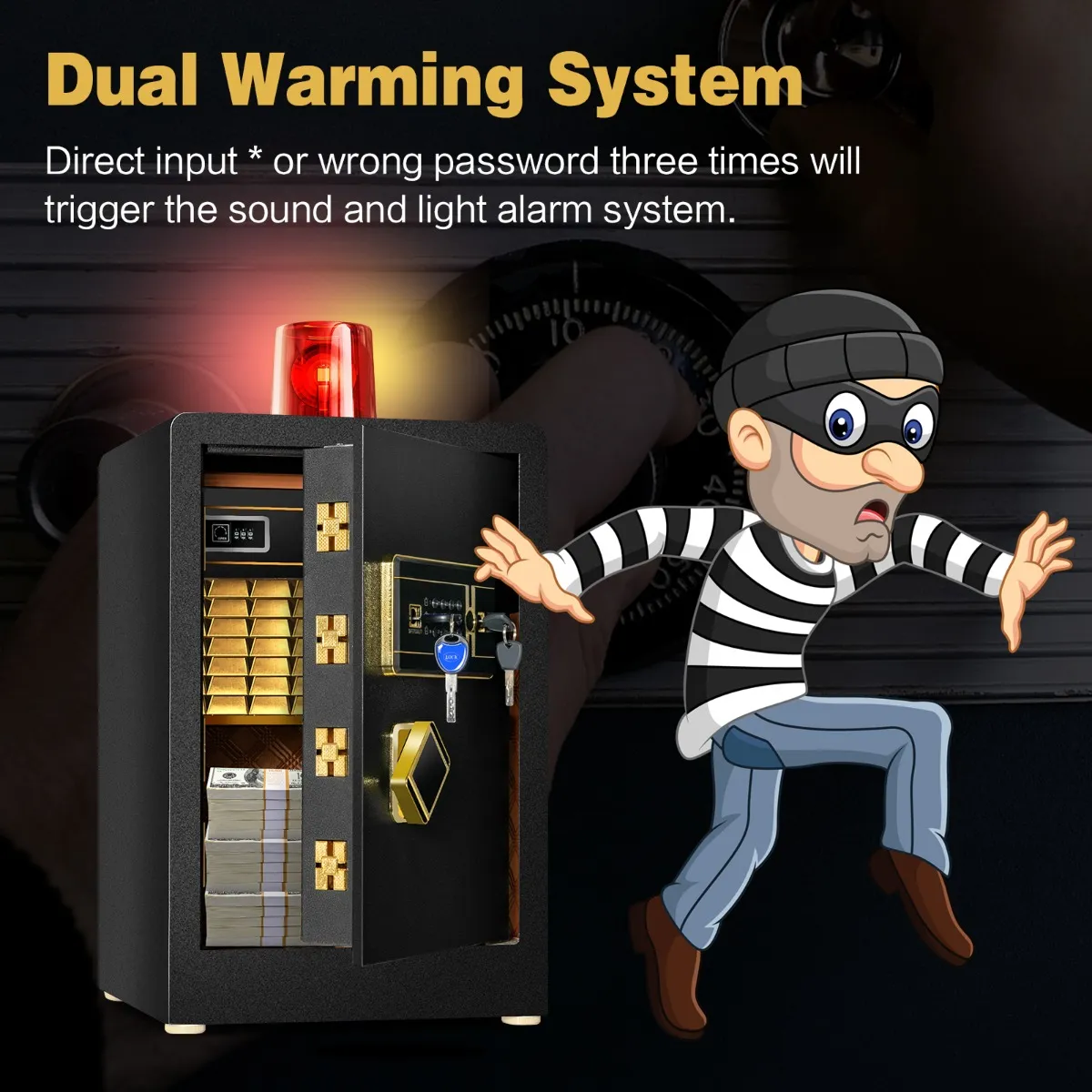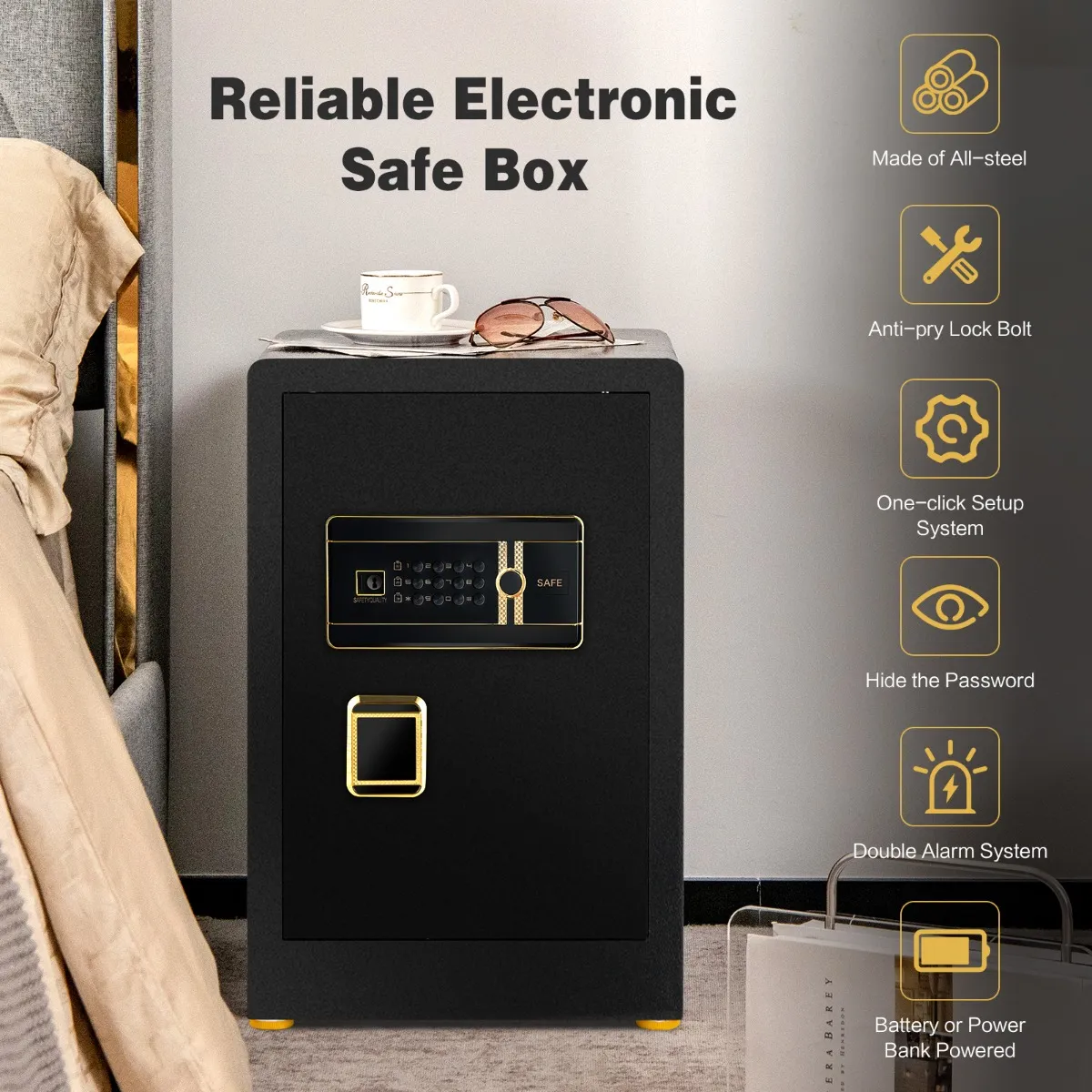 Moet u wat contant geld, cheques, creditcards of geheime documenten in uw huis of kantoor bewaren? Om ze veilig te maken, is het zeer belangrijk om een kluis te hebben! Met de grote capaciteit van 42,5 liter, kan deze kluis al uw waardevolle persoonlijke items bevatten! Het heeft een interieur met vergrendeling, een verwijderbare plank en een ingebouwde haak, waarmee u uw bezittingen kunt sorteren voor een gemakkelijkere zoektocht. Wat de veiligheid betreft, hoeft u zich ook geen zorgen te maken. Zes ingekeepte bouten en de superdikke deur kunnen ervoor zorgen dat de kluis nooit kan worden opengeprikt.Drie verkeerde wachtwoordinvoer zal het alarm activeren, en het invoeren van het juiste wachtwoord zal het alarm uitschakelen.U kunt dit nuttige kastje aan de muur bevestigen met expansiebouten, of het direct aan de zijkant van de tafel zetten: het zal niet te veel ruimte in beslag nemen, maar kan u wel de meeste veiligheid bieden.