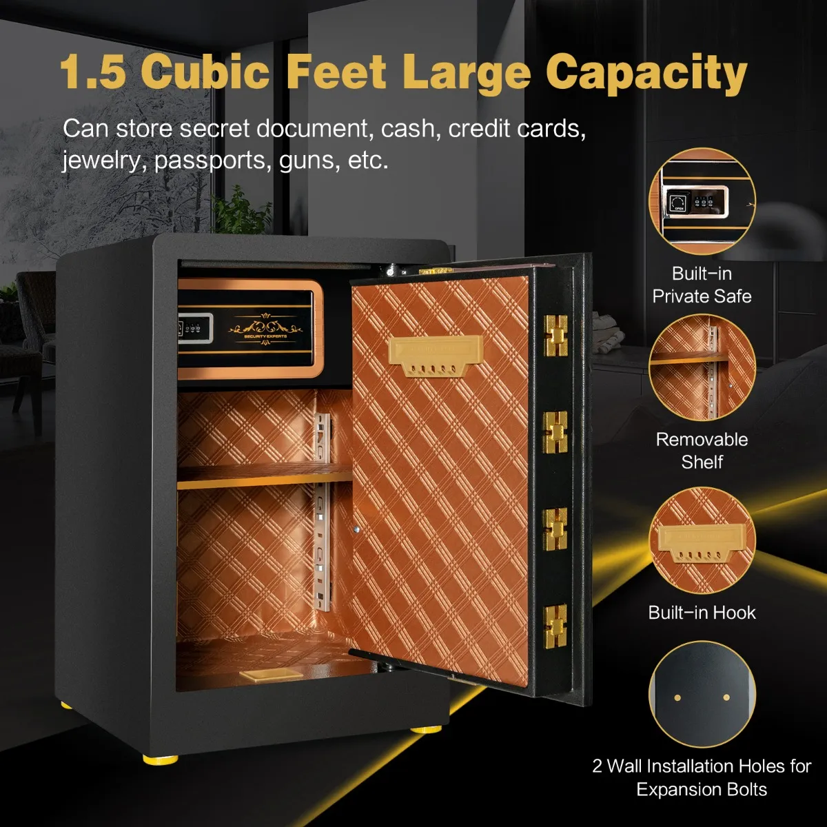 【Een exclusieve interne vergrendelingskast】: Onze digitale kluis heeft ook een binnenkast met een tuimelcombinatieslot. Zelfs in de situatie dat u uw kluis met anderen moet delen, kunt u nog steeds een veilige plaats hebben voor uw eigen waardevolle spullen en een apart wachtwoord instellen. Het ontwerp van de binnenkast kan u ook in staat stellen uw verschillende soorten items te sorteren en biedt extra bescherming.