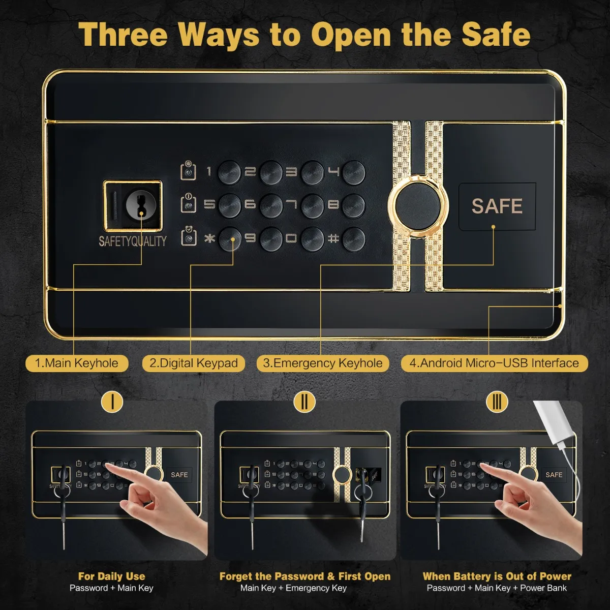 【Dubbel alarmsysteem & 2 manieren van stroomvoorziening】: Deze kluis is uitgerust met een dubbel alarmsysteem. Het geluids- en lichtalarm wordt geactiveerd wanneer de dief 3 keer een verkeerd wachtwoord invoert of wanneer de kluis met geweld wordt geraakt. Het alarm kan worden gestopt door het juiste wachtwoord in te voeren. De kluis kan worden gevoed door 4 AA-batterijen (niet meegeleverd) of een powerbank, zodat u gemakkelijk een oplossing kunt vinden wanneer de kluis is uitgeschakeld.