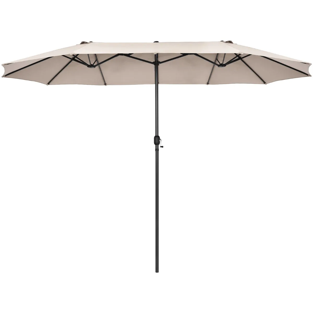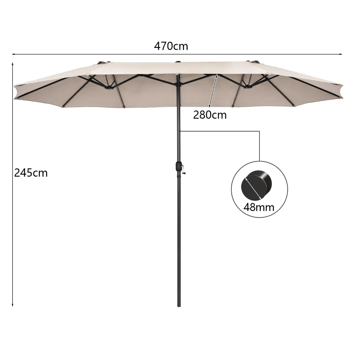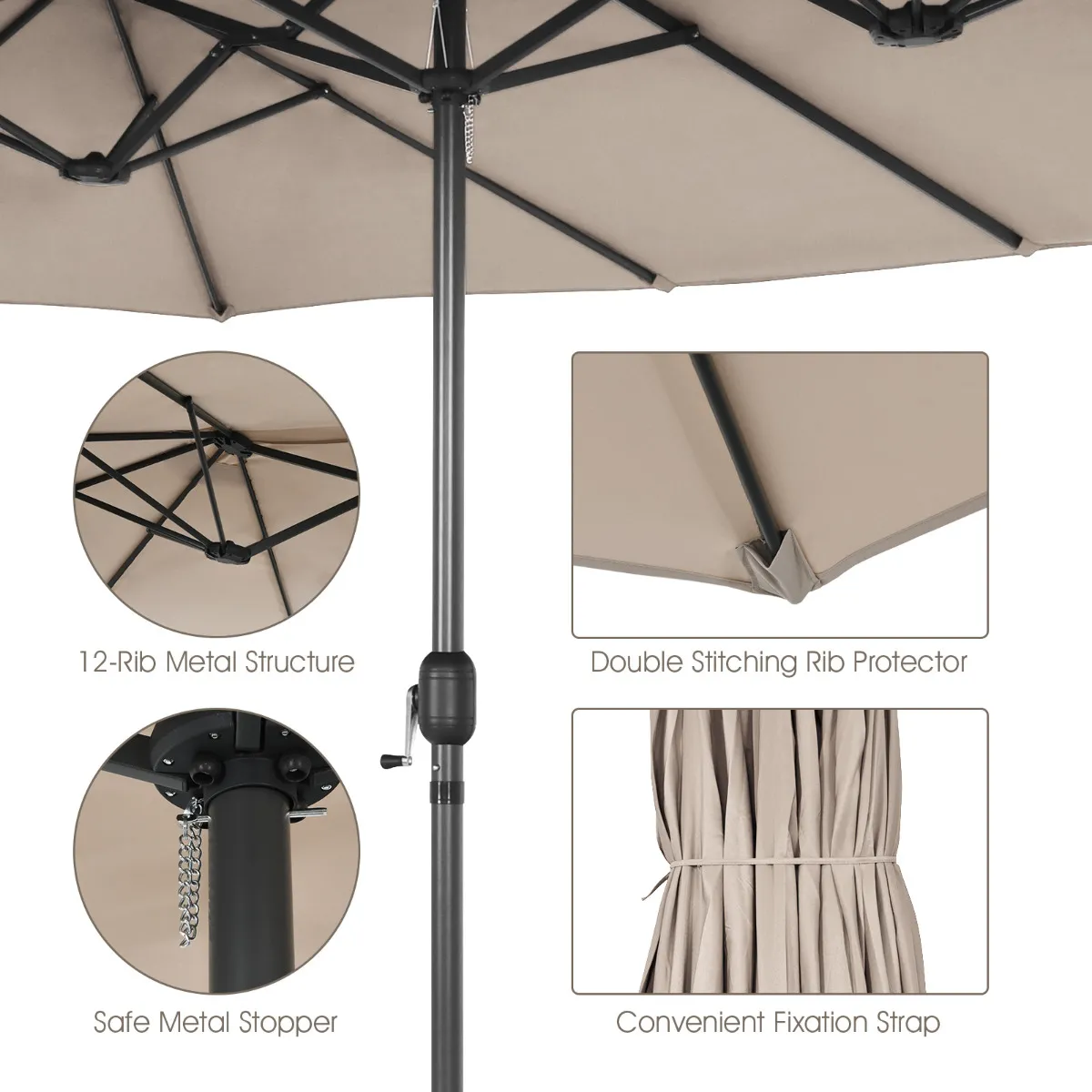 Brede toepassing op verschillende plaatsen: Deze dubbele paraplu met effectieve zonbescherming is geschikt voor verschillende stijlen van outdoordecoratie, zoals patio, tuin en achtertuin. Deze paraplu kan ook gebruikt worden in commerciële ruimtes, om schaduw te creëren voor openluchtmarkten, cafés en bars.