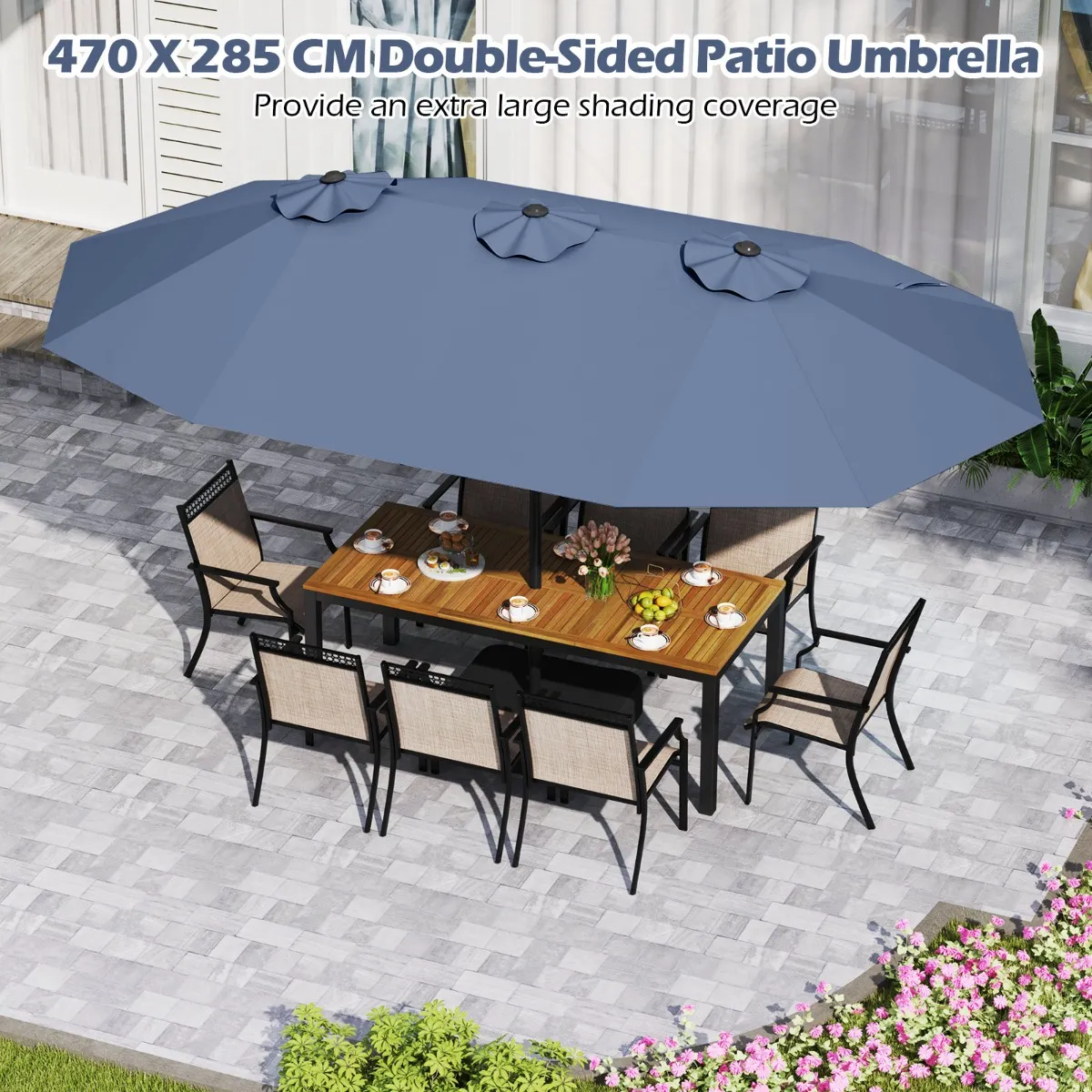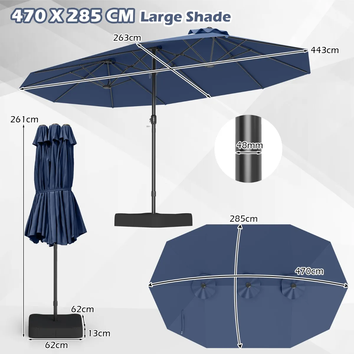 【Groot parasoloppervlak】: Met een royale afmeting van 470 x 285 x 261 cm (L x B x H) biedt de grote dubbele terras parasol een uitgebreide schaduwdekking voor je bijeenkomsten en activiteiten buiten. Met een parasolstok met een diameter van 48 mm is hij perfect te combineren met eettafels buiten.