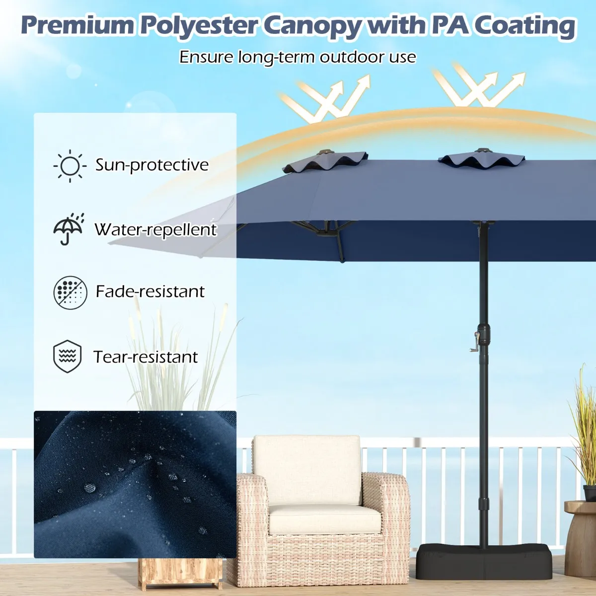 Onze dubbele parasol biedt voldoende schaduw, ideaal voor een barbecue in de tuin of voor een rustige ontspanning bij het zwembad. Het geheel wordt geleverd met een verzwaarde voet met 2 zandzakken die tot 80 kg zand kunnen bevatten, aangevuld met 12 metalen baleinen en een veiligheidssluiting. 3 ventilatieopeningen aan de bovenkant zorgen voor extra stabiliteit en ventilatie. Gemaakt van hoogwaardig polyesterweefsel met PA-coating, biedt het uitzonderlijke bescherming tegen de zon en is het waterbestendig, waardoor het geschikt is voor langdurig buitengebruik.