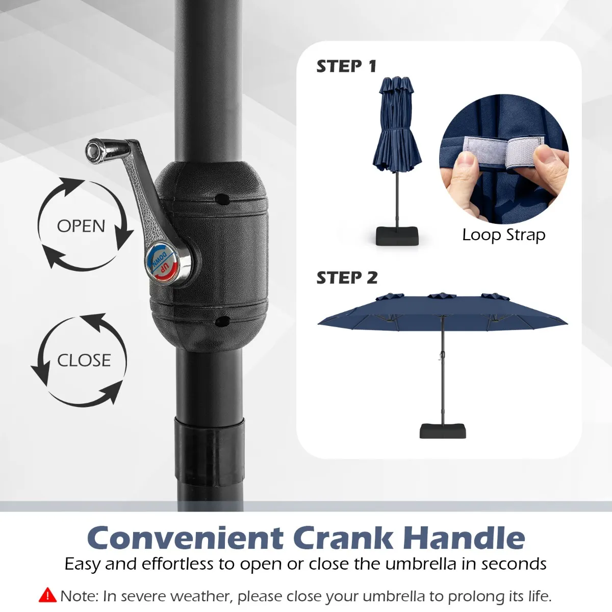【Eenvoudige installatie en verwijdering】: Ontworpen in 3 secties en voorzien van probleemloze aansluitingen, is deze terrasparasol eenvoudig te installeren, zonder gereedschap. Dankzij de handige zwengel is de parasol ook gemakkelijk te openen en te sluiten. Bovendien is er een lusband om de parasol vast te zetten als je hem niet gebruikt.