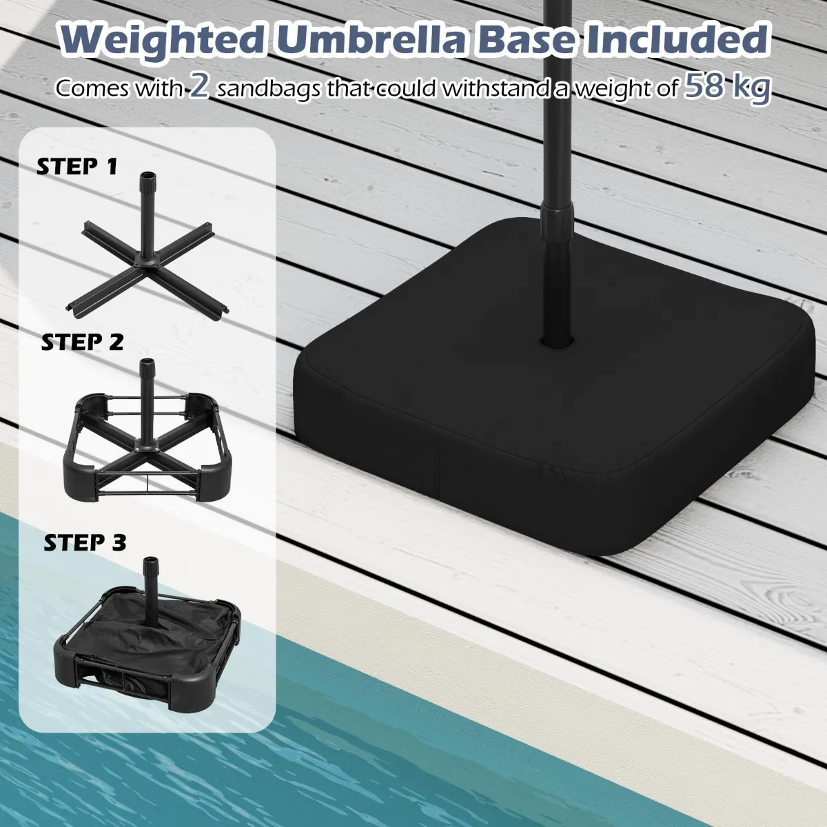 【Verzwaarde parasolvoet inbegrepen】: Deze grote tafelparasol wordt geleverd met een verzwaarde voet, inclusief 2 zandzakken die een gewicht van 80 kg kunnen dragen, voor een uitstekende stabiliteit. Ideaal voor verschillende commerciële en residentiële omgevingen, zoals terrasjes, restaurants, tuinfeestjes, bij het zwembad en nog veel meer.