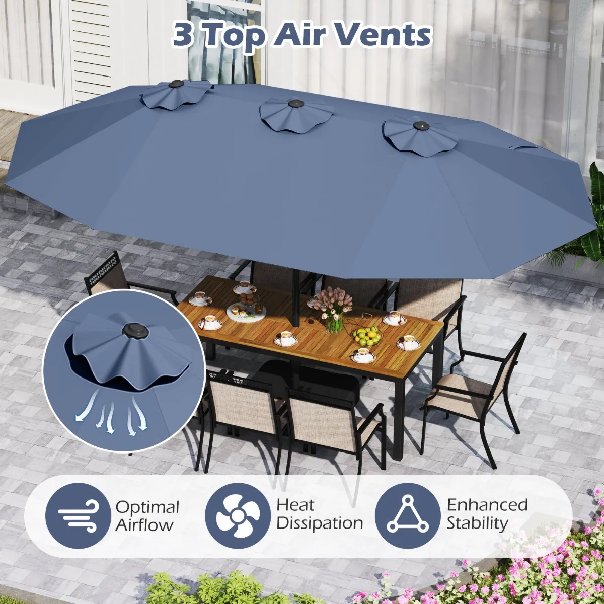 【Stabiele constructie】: Gebouwd met 5+2+5 stevige metalen baleinen, biedt deze parasol uitstekende stabiliteit en windbestendigheid. Bovendien heeft de parasol 3 ventilatieopeningen aan de bovenkant voor een optimale luchtcirculatie en warmteafvoer en een betere stabiliteit.