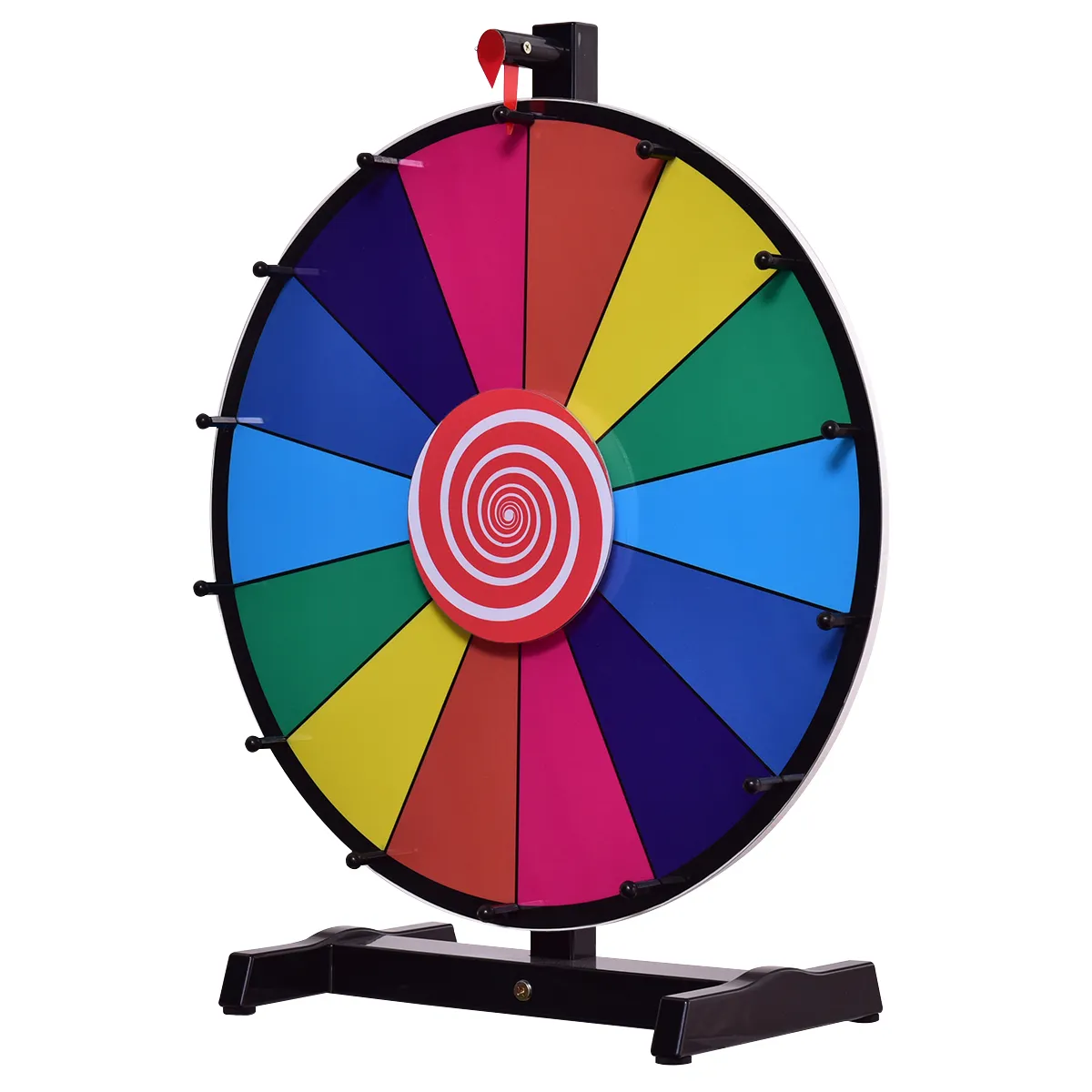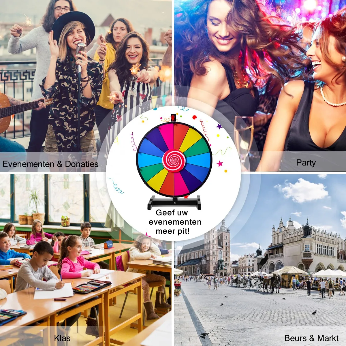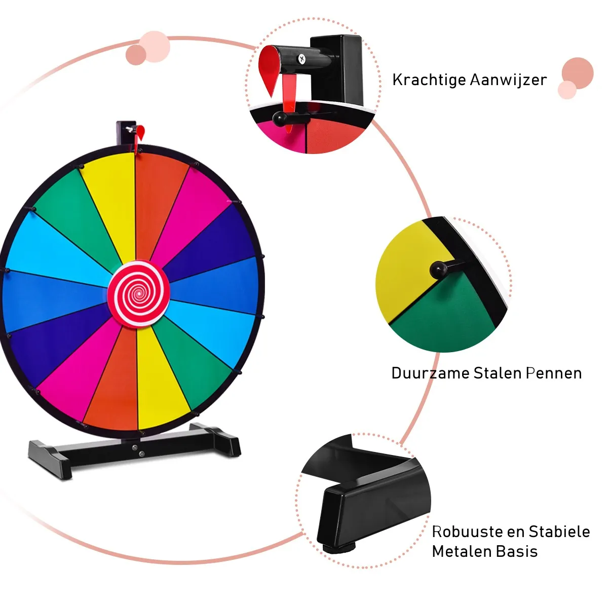 Met een grote voetstandaard is hij zeer stabiel – De grote H-vormige voetstandaard is gemaakt van hoogwaardig kunststof en geeft het rad van fortuin zijn stabiele standaard. De voetstandaard is ook afneembaar, dus het rad van fortuin is ruimte- besparen en gemakkelijk op te bergen.