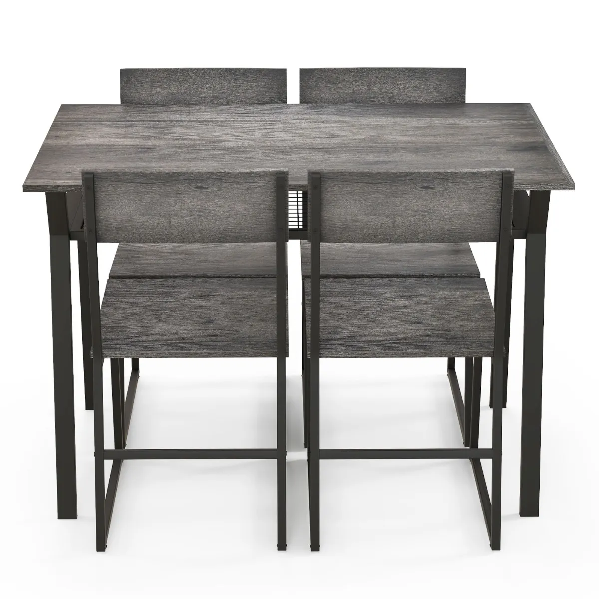 Deze set bestaat uit 4 stoelen en een rechthoekige tafel met een plank, die opbergruimte biedt voor keukenbenodigdheden. De stoelen zijn ontworpen met schuine rugleuningen voor optimale ondersteuning. De hele set wordt ondersteund door een metalen frame met poedercoating, wat zorgt voor een hoog draagvermogen, en het slijtvaste blad is gemakkelijk te onderhouden. De antislip glijders respecteren je vloer. Het elegante ontwerp en de neutrale kleur passen goed in verschillende interieurs. De stoelen kunnen onder de tafel worden geschoven, ideaal voor kleine ruimtes.