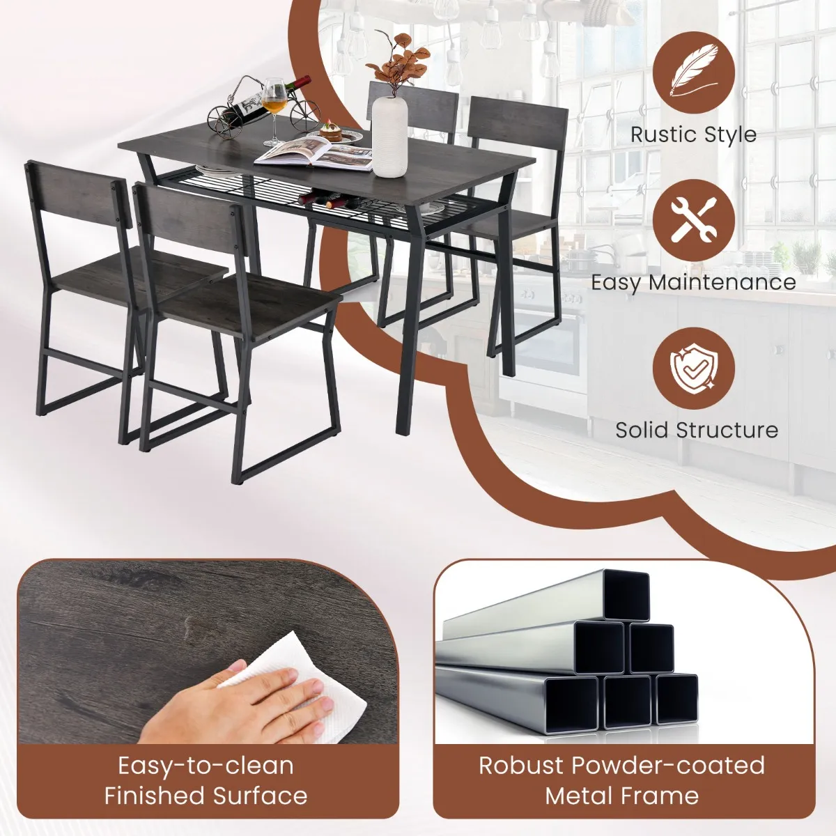 【Breed toepasbaar】: De eettafelset met rustieke afwerking is gemakkelijk schoon te maken zonder dat dit ten koste gaat van het onberispelijke uiterlijk. Bovendien past deze eettafelset dankzij het elegante ontwerp en de industriële stijl moeiteloos in verschillende inrichtingsstijlen in je keuken, eetkamer of woonkamer.