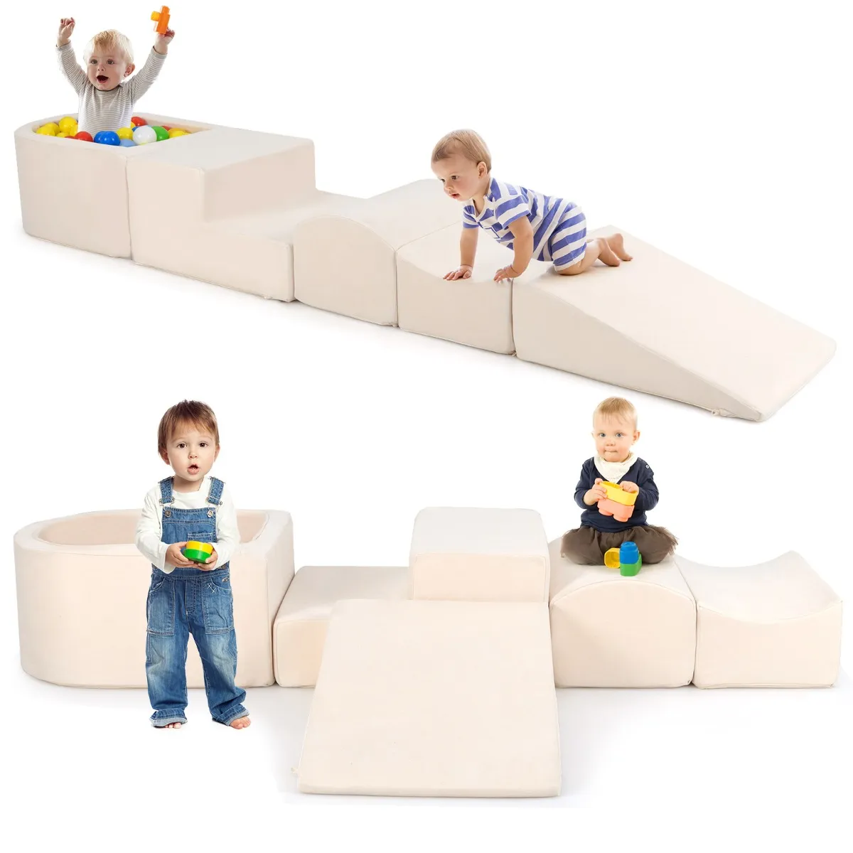5-delige klimbouwset: Deze zachte speelset bestaat uit 1 glijbaan, 1 opstapblok, 1 halve maan, 1 hol blok en 1 ballenbak die vrij gecombineerd kunnen worden. Kinderen kunnen hun fantasie de vrije loop laten en allerlei vormen bouwen. De ballenbak zorgt voor eindeloos speelplezier. *Let op: ballen niet inbegrepen.*