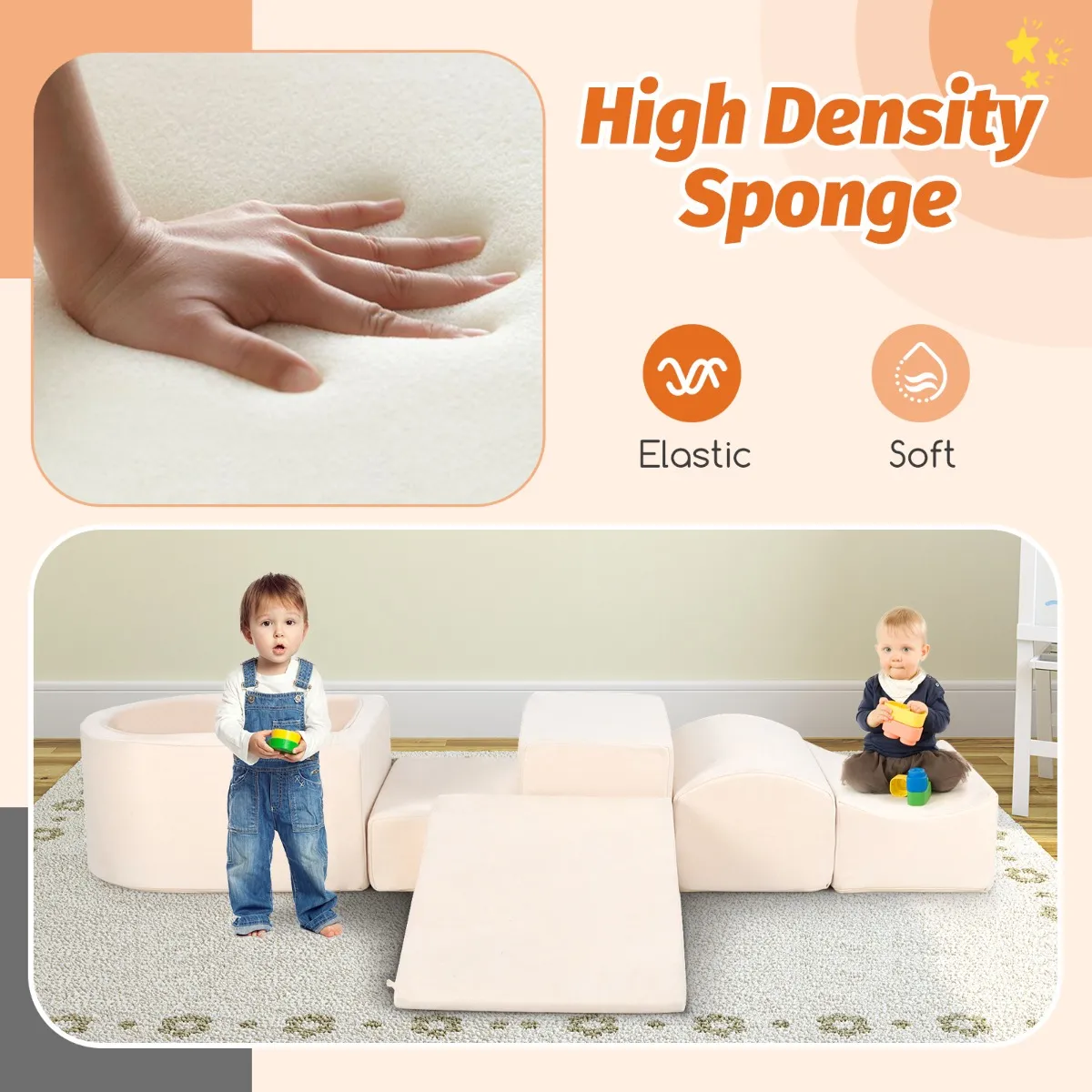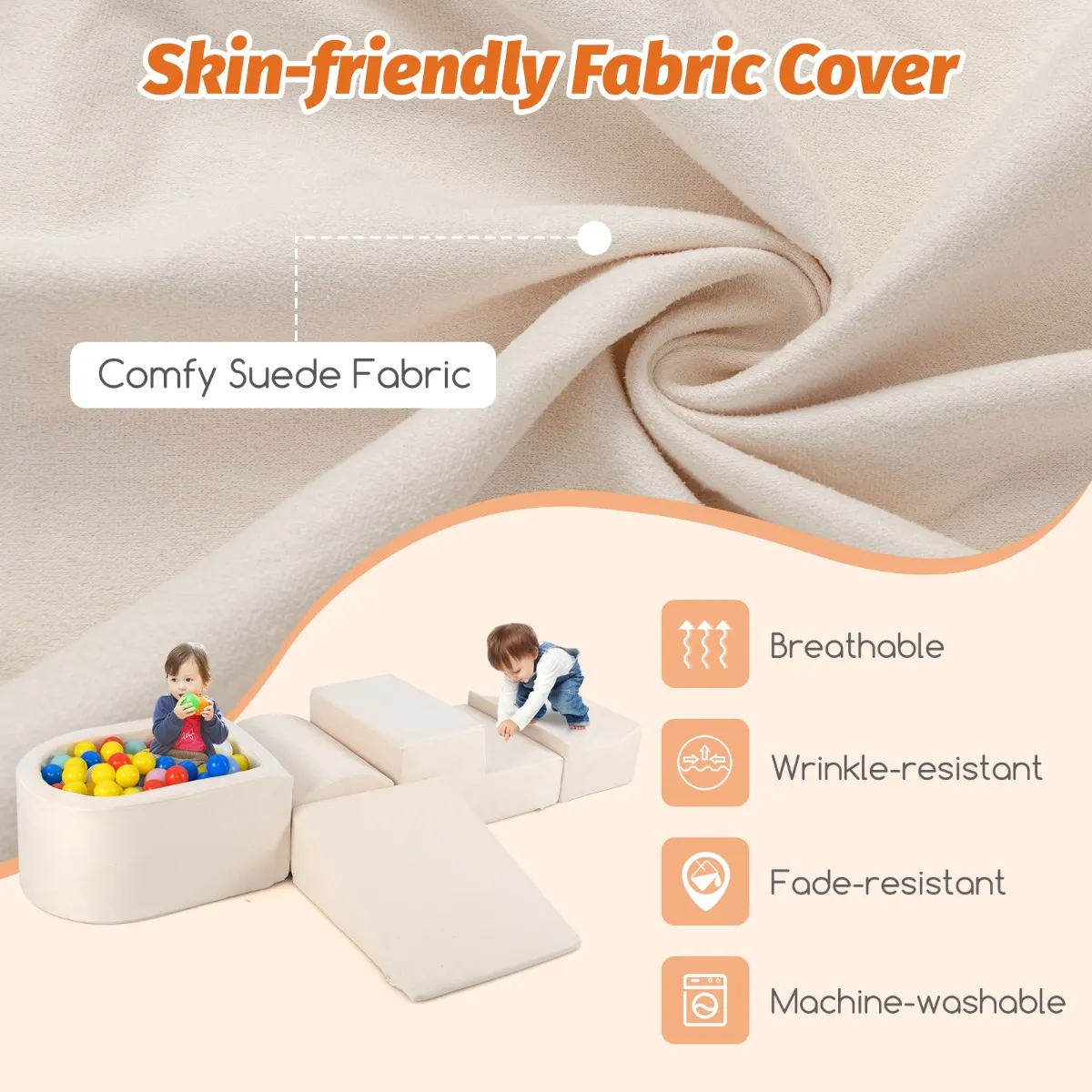 Zachte en duurzame materialen: De speelblokken zijn gemaakt van hoogwaardig, dicht schuim en bekleed met ademend suède. Dit zorgt voor een zachte en comfortabele aanraking. De fijne naden voorkomen dat de hoezen losraken, wat de levensduur verlengt.