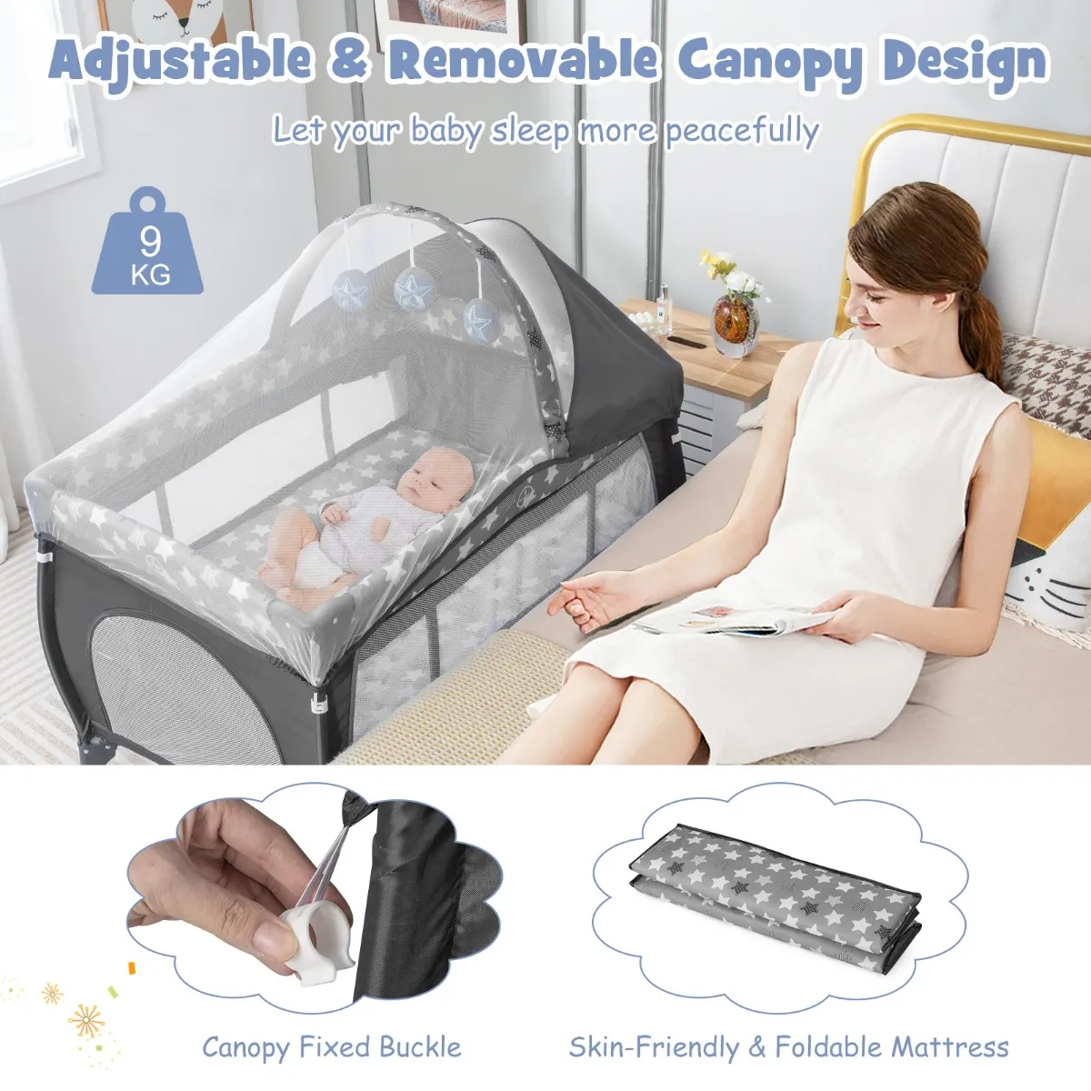 Dankzij het 5-in-1 multifunctionele design kan dit babybed ook als babybed met afneembare luifel en net, als babywieg, commode en als babybedje met zijdelingse ritsdeur worden gebruikt. De commode is uitgerust met een veiligheidsgordel en de opbergtas aan de zijkant van het babybed is praktisch voor het bewaren van luiers, babyflessen en meer.