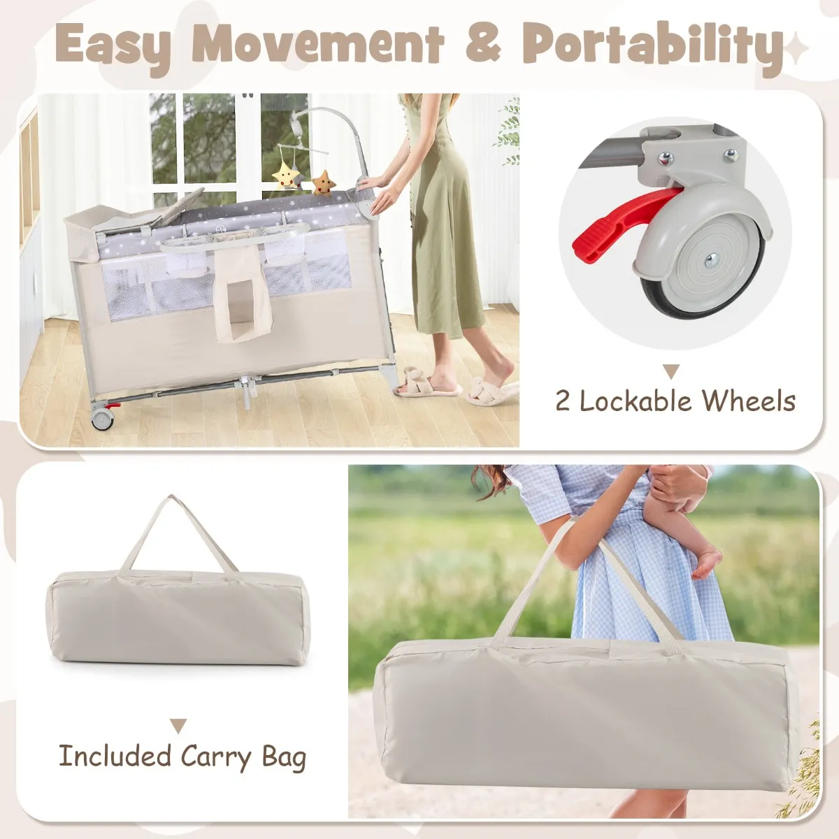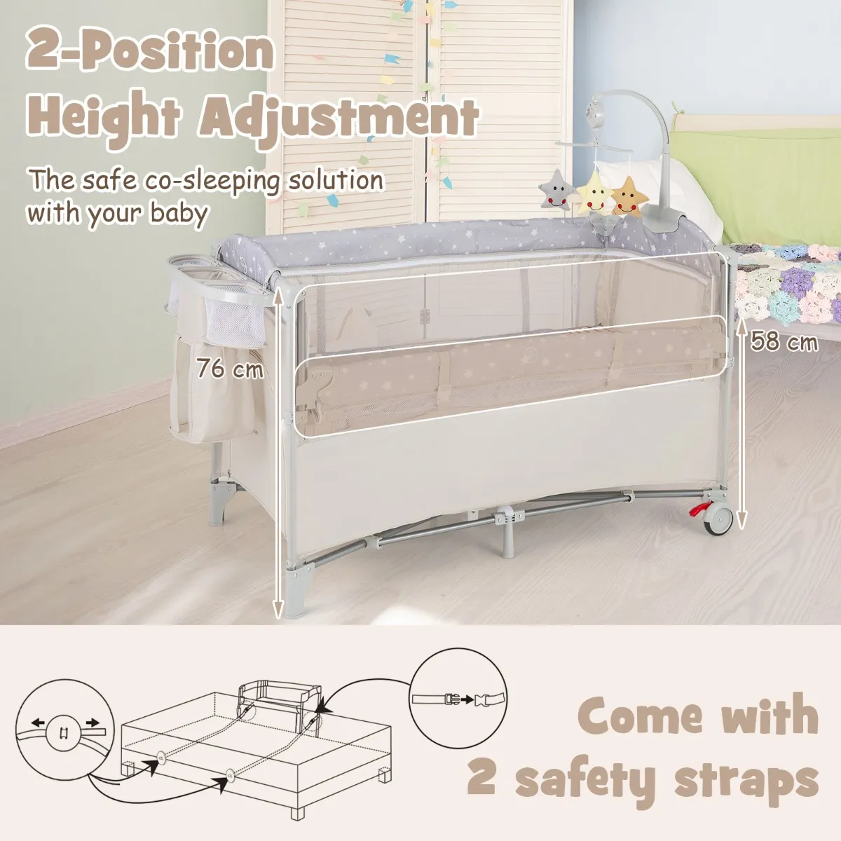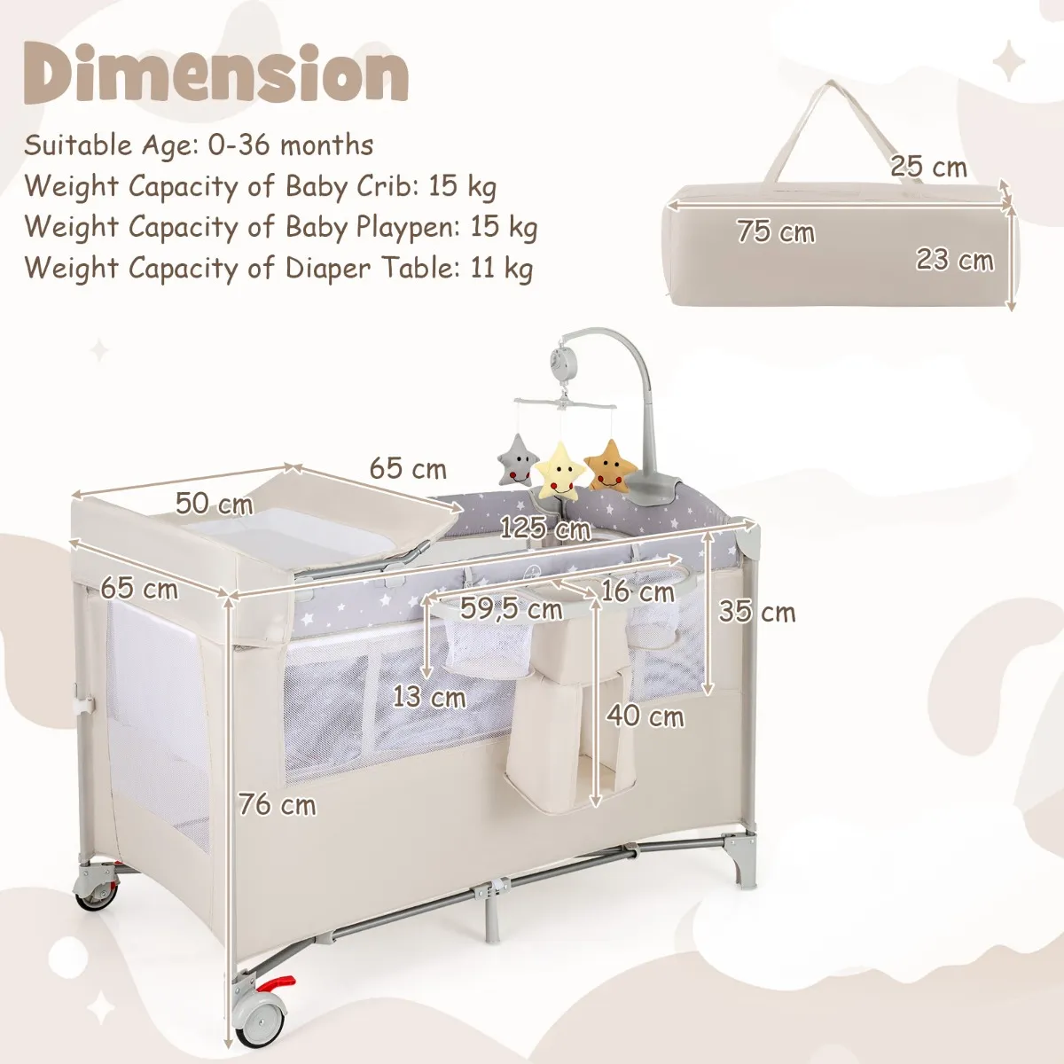 Dit kindercentrum is ook te gebruiken als wieg, luiertafel, box en activiteitencentrum. Het wordt geleverd met veiligheidsriempjes voor veilig samen slapen en voeden. De afneembare luiertafel en het opbergrekje maken het makkelijk om voor je baby te zorgen, terwijl het muziekdoosje en het hangende speelgoed voor rustgevend vermaak zorgen. Deze box is ideaal voor gezinnen die veel onderweg zijn en kan compact worden opgevouwen in de reistas voor gemakkelijk vervoer. Hij is gemaakt van stevige, kindveilige materialen voor een veilige omgeving.