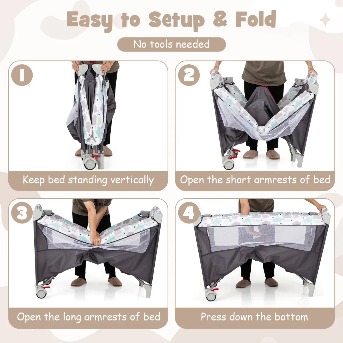 【Draagbaar voor gemakkelijk reizen】 Deze wieg is ontworpen voor actieve gezinnen, kan compact worden opgevouwen en wordt geleverd met een opbergtas voor probleemloos transport. Of je nu op bezoek gaat bij opa en oma of op vakantie gaat, het snelvouwmechanisme en de vergrendelbare wielen maken het gemakkelijk te verplaatsen en op te bergen.