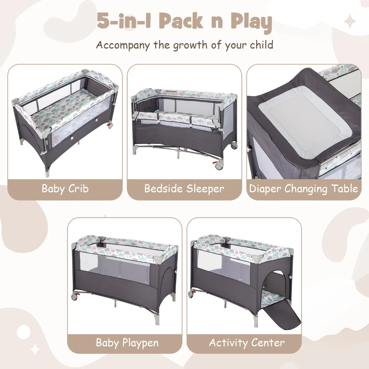 【Veelzijdige 5-in-1 functionaliteit】 Dit babykamermeubel is ontworpen om met je kind mee te groeien vanaf de geboorte tot de peutertijd. Het functioneert als een comfortabel babybedje, een praktische luiertafel, een veilig bedje, een leuke box en een boeiend activiteitencentrum, allemaal in één unit.