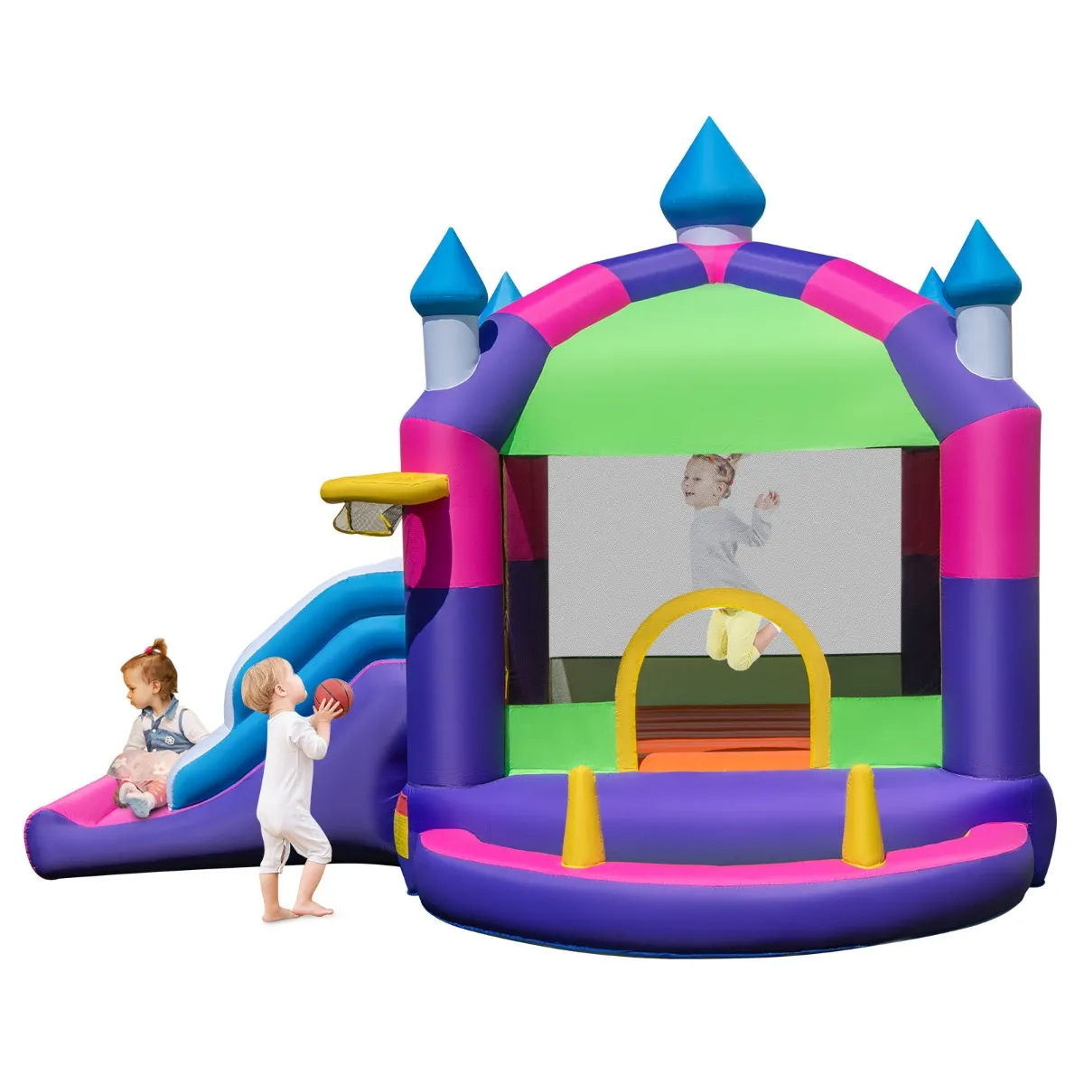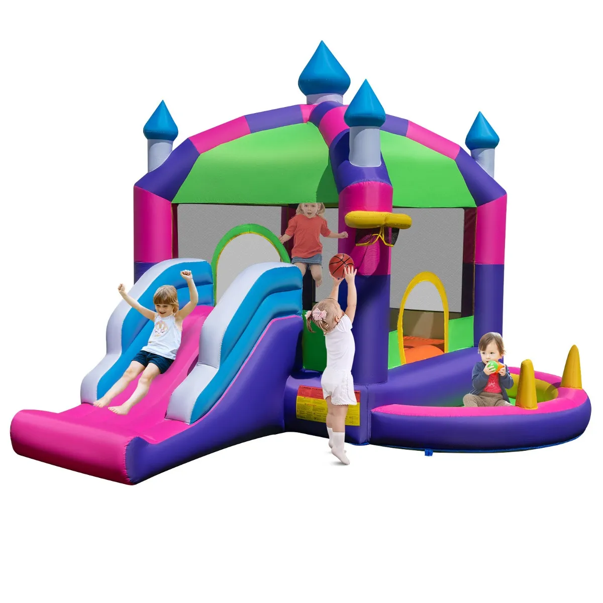 Ons 5-in-1 springkasteel is het beste cadeau voor kinderen! Dit product biedt meerdere speelmogelijkheden: het bevat een springgedeelte, een lange glijbaan, een oceaanbalbad, een basketbalring en een gebied voor ringwerpspellen. Het veilige net en verbeterde leuningen zorgen voor de veiligheid en duurzaamheid van het springkasteel. Uw kind kan hier gelukkig spelen met zijn vrienden. Het pakket bevat een gedetailleerde handleiding die u kan helpen bij het snel opzetten van het kasteel. Bovendien kunnen de meegeleverde grondankers het huis aan de grond bevestigen. Of het nu zomer of winter is, binnen of buiten, dit springkasteel is een speelparadijs voor kinderen om een geweldige tijd door te brengen met hun vrienden!