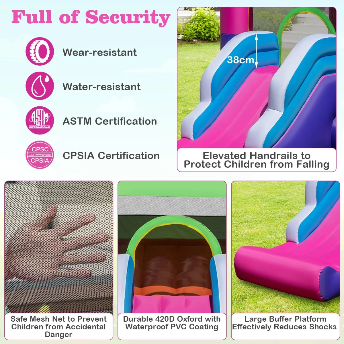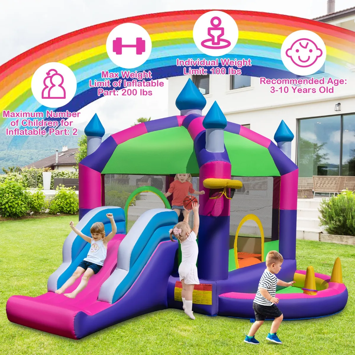【Alles-in-een entertainmentcentrum】: Ons springkasteel omvat een glijbaan, springgedeelte, ringwerpspel, oceaanbalbad en basketbalring. Het stelt uw kind en zijn vrienden in staat om samen te spelen, waardoor hun geest wordt gestimuleerd en hun lichaam wordt getraind.