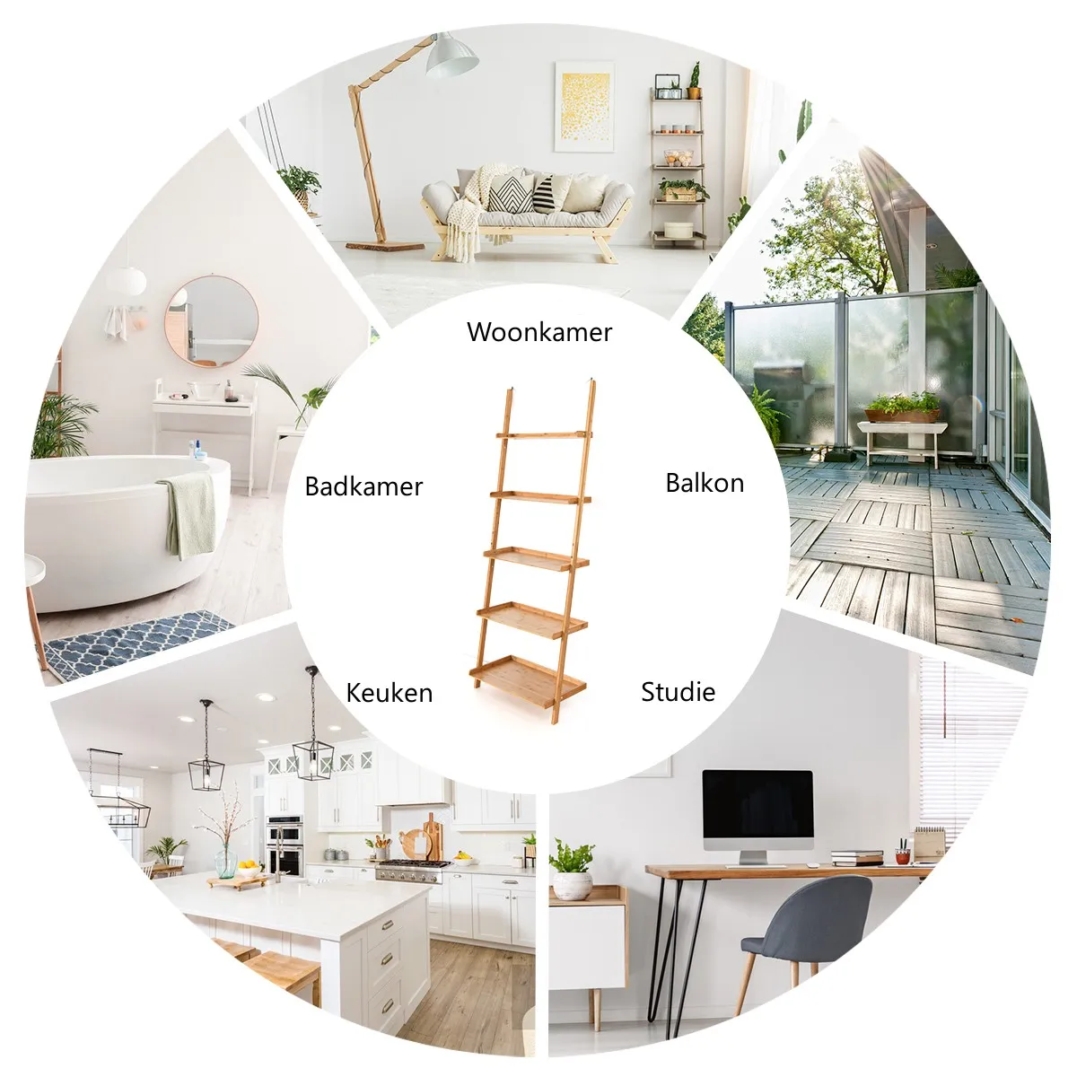 Vervaardigd met premiebamboe, is deze ladderplank niet alleen duurzaam en stevig, maar ook heeft goede ladings dragend. En het fijne vakmanschap maakt het ook gemakkelijk te onderhouden. Met zijn 5 lagen biedt de ladder een grote opslagruimte om uw spullen op te bergen en uw kamer schoon en netjes te houden. Zonder te veel ruimte in beslag te nemen, brengt de ladder opbergkast klassiek en elegantie. Dankzij de unieke structuur en het muurvaste ontwerp kan de plank stabiel aan de muur worden bevestigd. En de rand van de plank is voorzien van verhoogde balken om te voorkomen dat voorwerpen naar beneden vallen. Deze multifunctionele ladderplank kan niet alleen worden gebruikt in de badkamer, maar kan ook worden geplaatst in uw woonkamer, keuken of keuken om een perfecte organisator te zijn.
