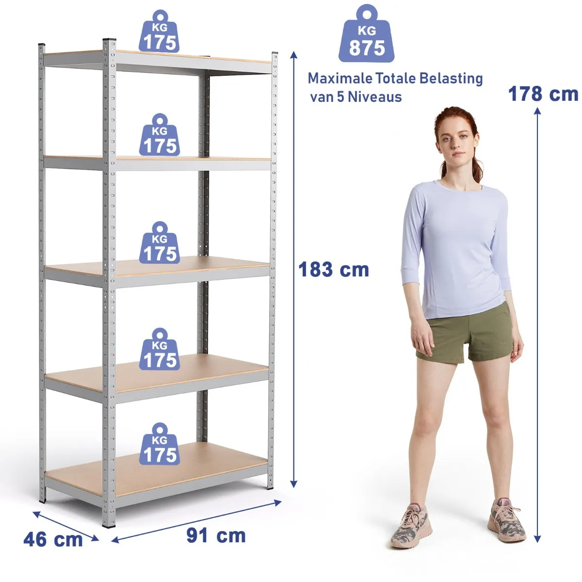 - Gewichtscapaciteit van elke plank: 175 kg