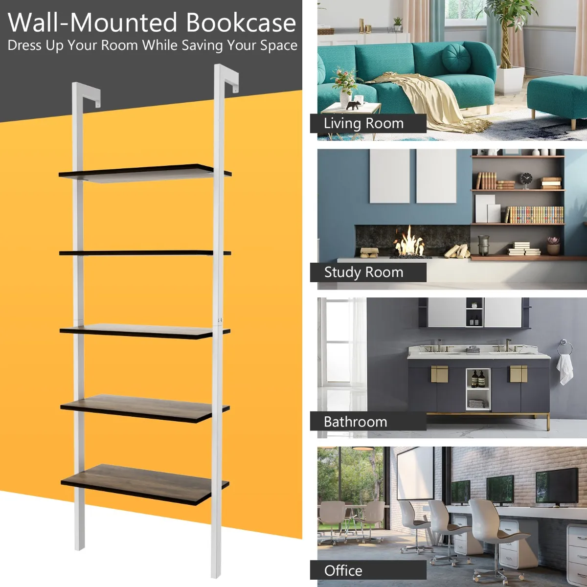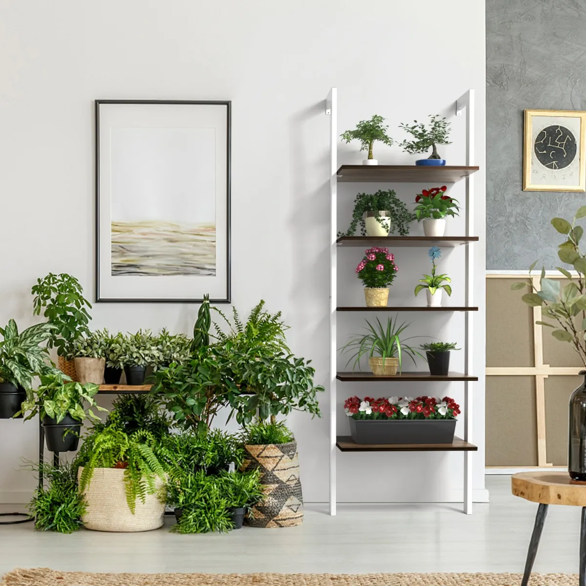 Dit ladderrek is gemaakt van spaanplaat en metalen frame. Daarom is het van hoge kwaliteit, duurzaamheid en uitvoerbaarheid. Het wordt op een ruimtebesparende manier bevestigd en biedt tegelijkertijd veel opbergruimte op de 5 stabiele planken voor boeken, fotolijstjes, planten en eventuele nutteloze spullen in uw huis of kantoor. Met een klassieke antieke stijl is het geschikt voor alle soorten gelegenheden, met name de woonkamer, badkamer, keuken, studeerkamer en het buiten balkon. Het kan goed passen bij uw andere meubelen, uw kamer esthetisch opwaarderen tot een nieuwe hoogte.