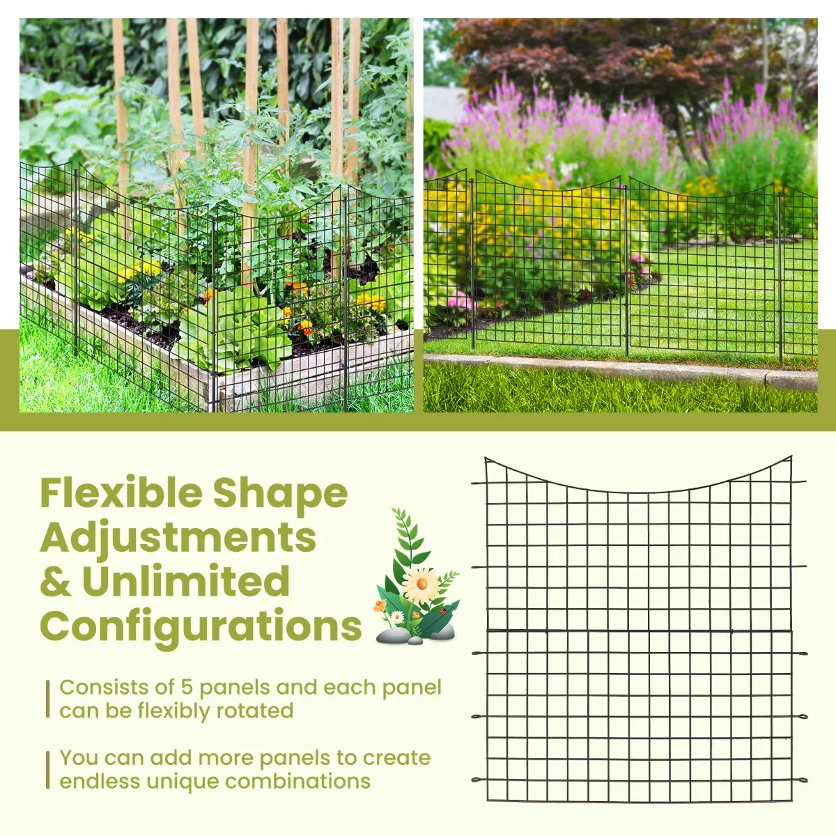 Ons decoratieve tuinhek bestaat uit 5 panelen en 5 hoge metalen palen, waarmee je naar behoefte verschillende vormen kunt creëren. Bovendien kun je heel eenvoudig meer toevoegen om je omheining uit te breiden. Bovendien bestaat deze omheining uit een zeer sterk, gepoedercoat metalen frame, is roestvrij en zo gebouwd dat hij bestand is tegen alle weersomstandigheden. En de opbouw is kinderspel – gewoon de hekelementen met hoge metalen palen verbinden en in de aarde steken. Nog belangrijker is dat hij niet alleen als tuinhek voor buiten, maar ook als omheining voor groentebedden, dierenafsluiting of wegbegrenzing kan worden gebruikt.