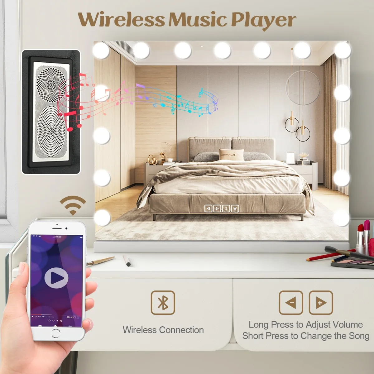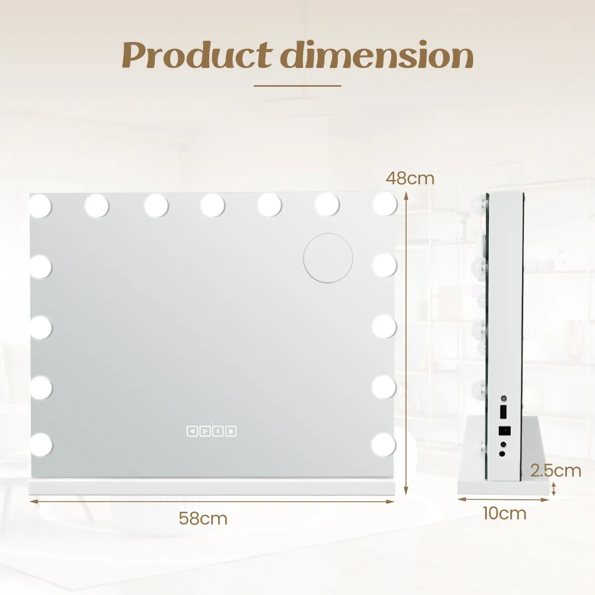 Behaal professionele make-up resultaten met onze hoffelijkheidsspiegel met 3 kleuren verlichting, uitgerust met 15 high-end lampen, voor de perfecte make-up look. Hij heeft 2 draadloze luidsprekers en een USB-oplaadpoort, zodat je je apparaten kunt opladen en je je kunt vermaken. Dankzij de aanraaktechnologie kun je de verlichting en het volume moeiteloos aanpassen met een simpele aanraking van het scherm. Het bevat ook een draagbaar vergrootglas voor het nauwkeurig aanbrengen van make-up en biedt 2 montagemogelijkheden – aan de muur of op tafel.
