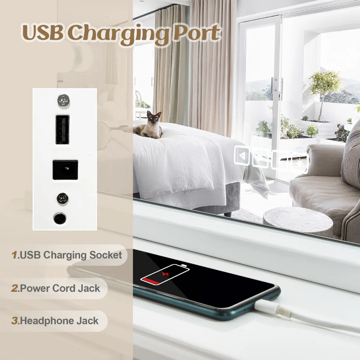 Draadloze muziekspeler : Met 2 ingebouwde draadloze luidsprekers kun je je apparaat op de spiegel aansluiten en meteen naar je favoriete muziek luisteren zonder je schoonheidsritueel te onderbreken. Deze spiegel heeft ook een USB-oplaadpoort zodat je je telefoon kunt opladen terwijl je je make-up doet.