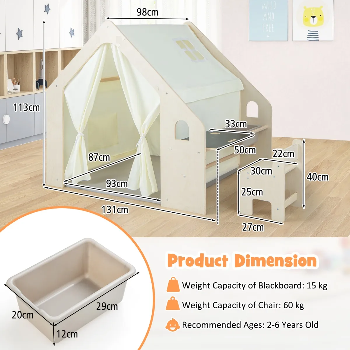 Uitgerust met een speeltent, een vloermat, een tafel, een voorraadcontainer en een stoel biedt dit 6-in-1 speelhuis voor binnen kinderen een overvloed aan speelmogelijkheden. Bovendien zorgt de stabiele houten constructie ervoor dat deze speeltent een lange levensduur heeft. Met een huidvriendelijke en ademende mat zorgt het voor een gezellige sfeer. De tafel en de stoel hebben de perfecte maat voor de kleintjes en dragen een gewicht van maximaal 15 of 60 kg. En de tafel met dubbelzijdig design kan met klittenbandsluitingen eenvoudig worden omgebouwd.