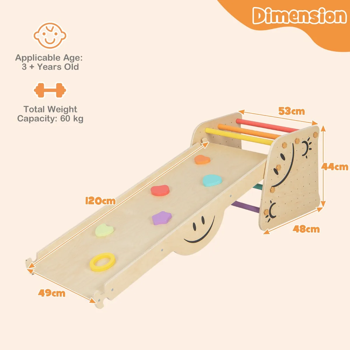 Deze 6-in-1 speelset kan worden gebruikt als glijbaan, hellingbaan, wip, klimladder, opstapje en krukje met rugleuning, om je kind aan te moedigen wat beweging te krijgen. De set bevat een 3-in-1 converteerbare trapladder en een dubbelzijdige helling om op te spelen. Hij is in hoogte verstelbaar zodat verschillende kinderen hem kunnen verkennen. De houten panelen en massief houten spijlen zorgen voor duurzaamheid, terwijl de driehoekige structuur voor stabiliteit zorgt. Het draagt een totaal gewicht van 60 kg, is betrouwbaar en creëert een veilige speelplek.