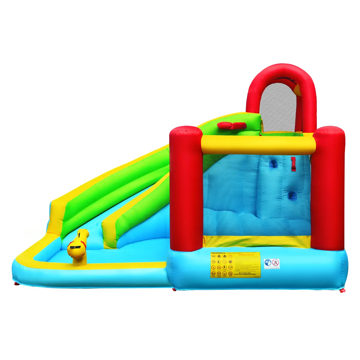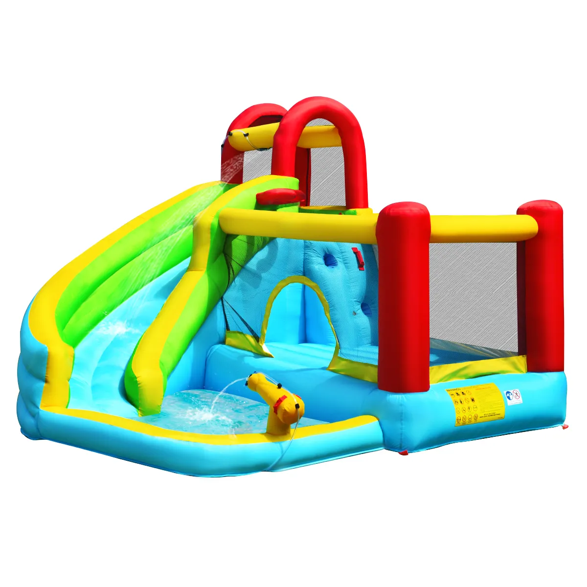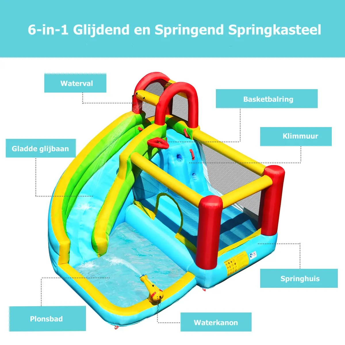 Inclusief een waterglijbaan, zwembad, klimmuur, springhuis en basketbalhoepel