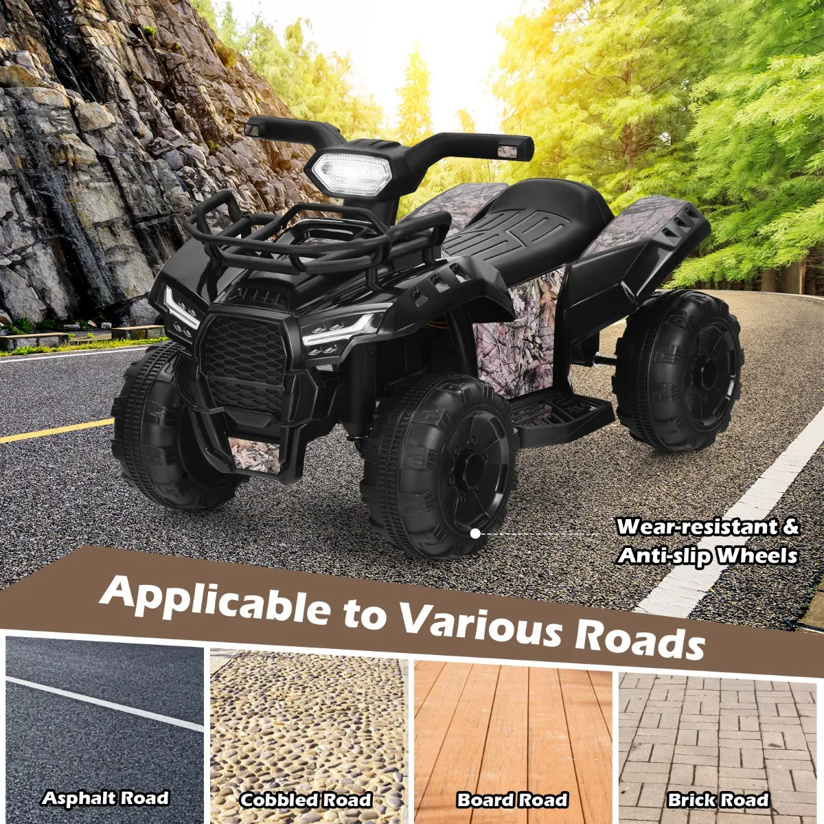 4 slijtvaste wielen: 4 antislipwielen zijn duurzaam en slijtvast en geschikt voor zowel binnen als buiten. Ons voertuig kan rijden op elke over het algemeen vlakke ondergrond, zoals een houten vloer, stenen pad, asfaltweg, enz. Gebruik het voertuig niet op grasvelden.