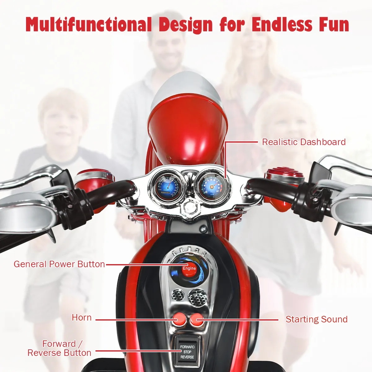 【Perfect cadeau om uw kinderen te verrassen】Een dierbare jeugdherinnering is kostbaar voor zowel ouders als kinderen. Deze motorfiets in chopper stijl is een perfecte cadeau voor uw kinderen, maar ook een actief stuk speelgoed voor jongens en meisjes. Bovendien, is het vermeldenswaard dat de motorfiets uit veiligheid genoeg materialen bestaat, zodat is er geen zorg over zijn gebruikende betrouwbaarheid.