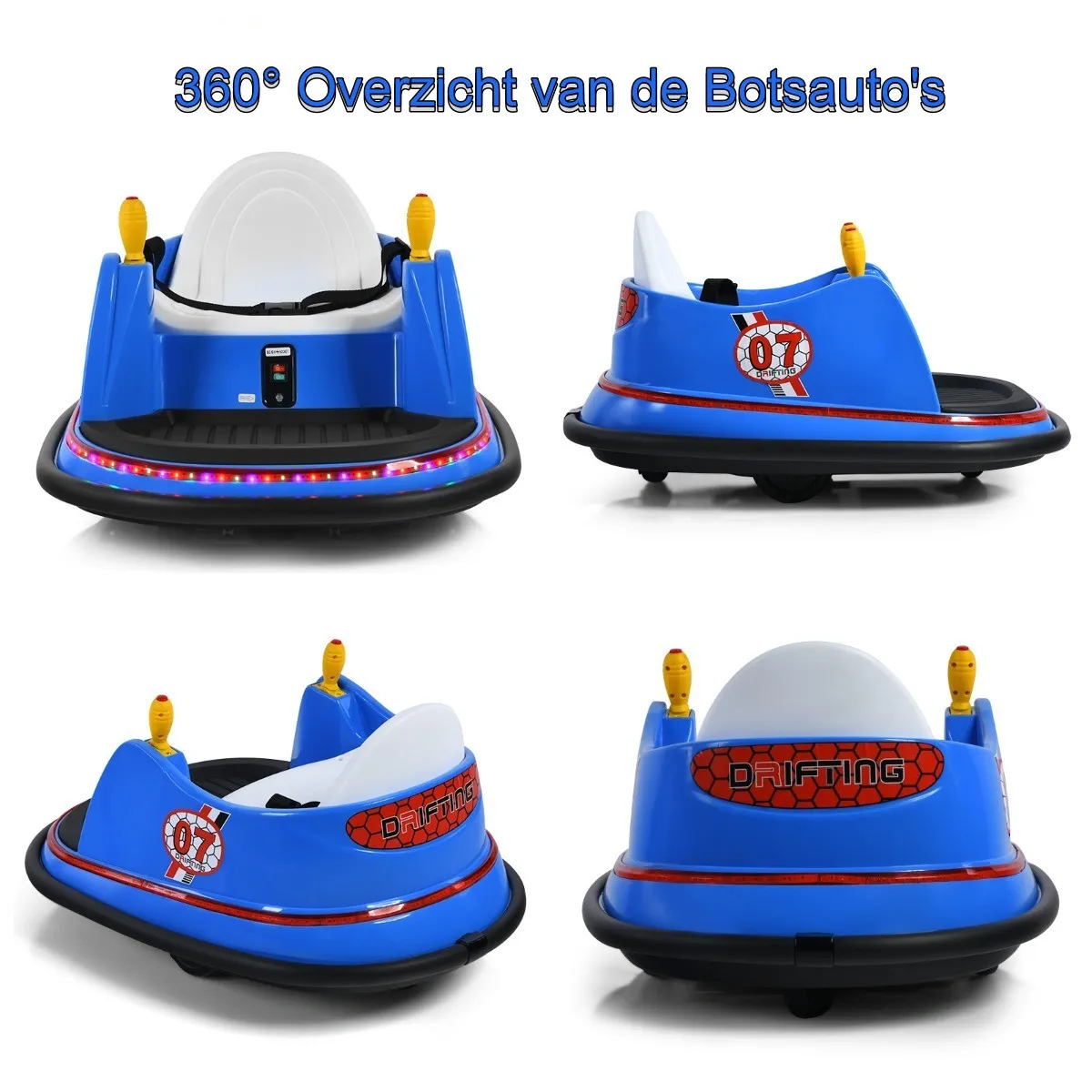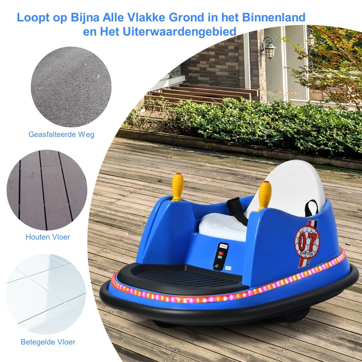 Het frame is gemaakt van duurzaam pp & staal, en bedekt met een ronde van een zachte buffer die het mogelijk maakt deze rijden op botsauto om rond te botsen. 2 aandrijfwielen plus 2 spinnewielen zorgen ervoor dat de auto op de meeste vlakke ondergrond kan rijden en zelfs 360 graden kan draaien. De premium motoren sturen de botsauto met 1,3 mph met een slow start systeem om soepelheid te garanderen terwijl de 6V 4,5A batterij de auto een duurzame 40 min speeltijd geeft. Deze rijden op botsauto wordt volledig bestuurd door eenvoudige joysticks met licht en geluid en is ook onder toezicht van een 2,4G afstandsbediening.