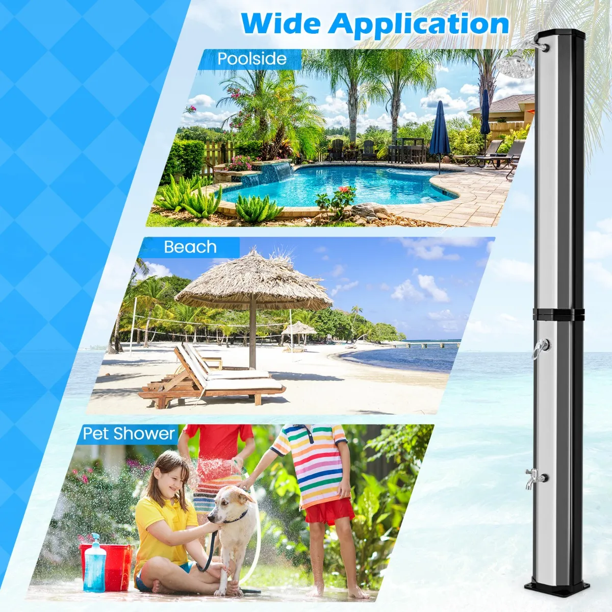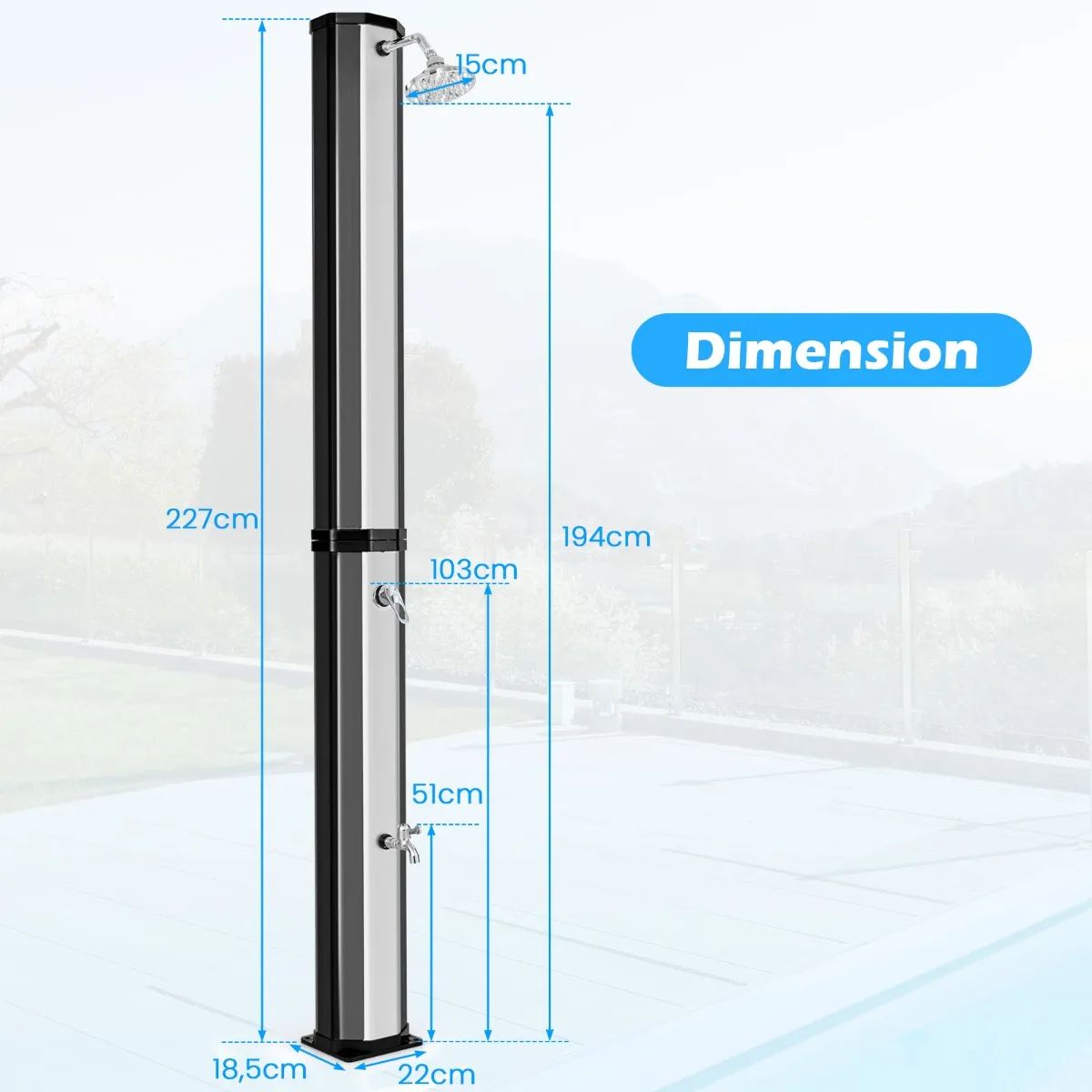 【Goed afgewerkte details】: Deze op zonne-energie verwarmde buitendouche is gemaakt van PVC en verchroomd ABS-materiaal van hoge kwaliteit en biedt duurzaamheid en stijl. Het robuuste ontwerp is bestand tegen verschillende weersomstandigheden en belooft een langdurig buitengebruik.