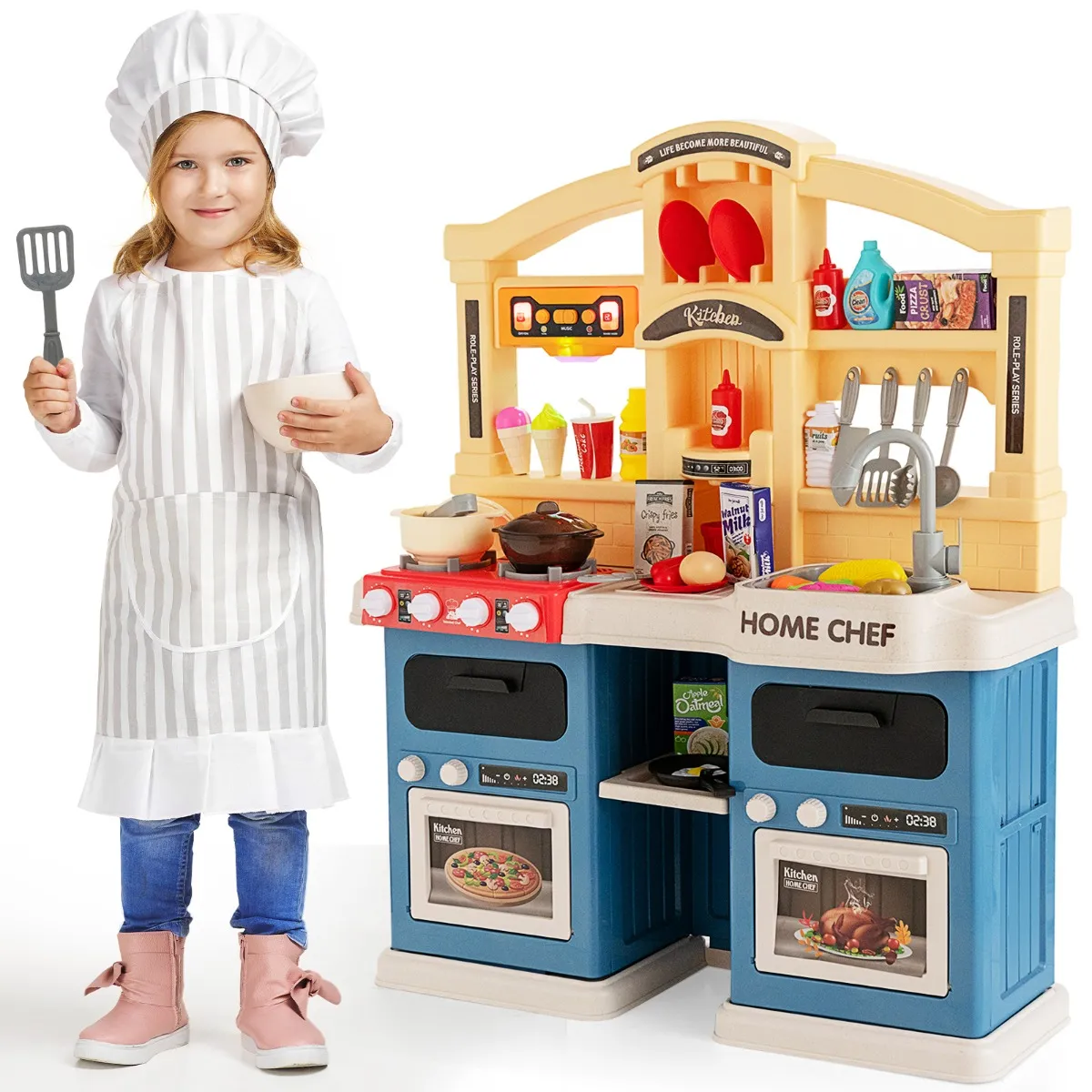 Onze kinderkookset bevat 2 fantasiepannen met lichteffecten, stoom- en kookfuncties voor een realistische ervaring. De kap is voorzien van verlichting, geluidseffecten en muziek. De kraan en de gootsteen zorgen voor stromend water voor het wassen van voedsel, en met 69 realistische accessoires kunnen ze koken als een echte chef-kok. Aan de haken en schotelmandjes kunnen ze verschillend speelgoed opbergen. Ze kunnen met plezier koken en hun vaardigheden en verbeeldingskracht ontwikkelen. Voor extra veiligheid is elke hoek en rand gepolijst.