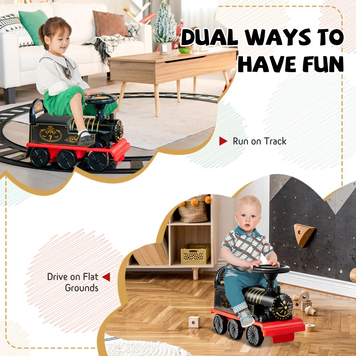 Kenmerkend retro stijl en uitstekende stickers, is deze elektrische trein goed gemaakt en super leuk. Deze trein set bevat ook 16 stuks tracks die een cirkel trein spoor van 220cm diameter kan maken. Meer dan binnengebruik, kan dit treinspeelgoed ook op het vlakke buitenterrein rijden. Door voeten op de intrekbare voetpedalen te plaatsen, zullen kinderen comfortabeler zijn. En ze kunnen zijn geliefde speelgoed of snacks opbergen in de verborgen opbergbox onder de zitting wanneer ze naar buiten gaan. Bovendien voorkomen de rugleuning en het anti-kantel accessoire onverwacht omrollen. Met behulp van eenvoudige installaties van de ouders kunnen kinderen genieten van hun gelukkige rijtijd met treinfluit en heldere lichten.