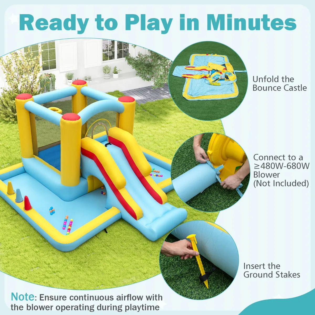 【Met één druk op de knop geïnstalleerd】: Laat je vrienden in een mum van tijd een feestje bouwen! Vouw het springkussen open, sluit het aan op een blower van ≥480W (niet meegeleverd) en zie het tot leven komen. Er worden grondpennen meegeleverd voor een stevige installatie, zodat kinderen zorgeloos kunnen springen.