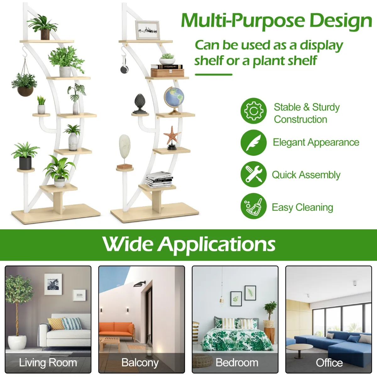 Onze 7-lagen metalen bloemenplank biedt voldoende ruimte om uw diverse planten en decoraties te tonen, waardoor uw ruimte opgeruimd en schoon is. U kunt het gebruiken als een display plank om uw boeken, collecties, fotolijsten, of trofeeën in de ingang of woonkamer te tonen. En het is ontworpen met een gebogen vorm als een halve maan, die kan opvallen in uw huisdecoratie. Meer dan dat, het wordt ondersteund door een zwaar gepoedercoat stalen frame, dat sterke ondersteuning biedt en zorgt voor een groot laadvermogen. En dankzij het anti-kantelmechanisme hoeft u zich geen zorgen te maken over omvallen en het vernielen van uw favoriete planten. Onze ladder bloempotten standaard is een veilige en redelijke plaats voor uw planten en decoraties en voegt tegelijkertijd een hoogtepunt toe aan uw huis.