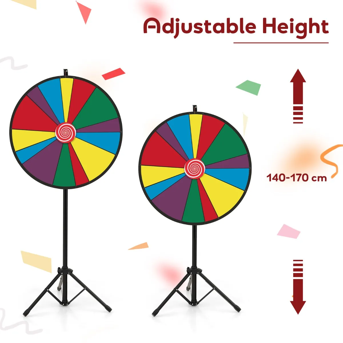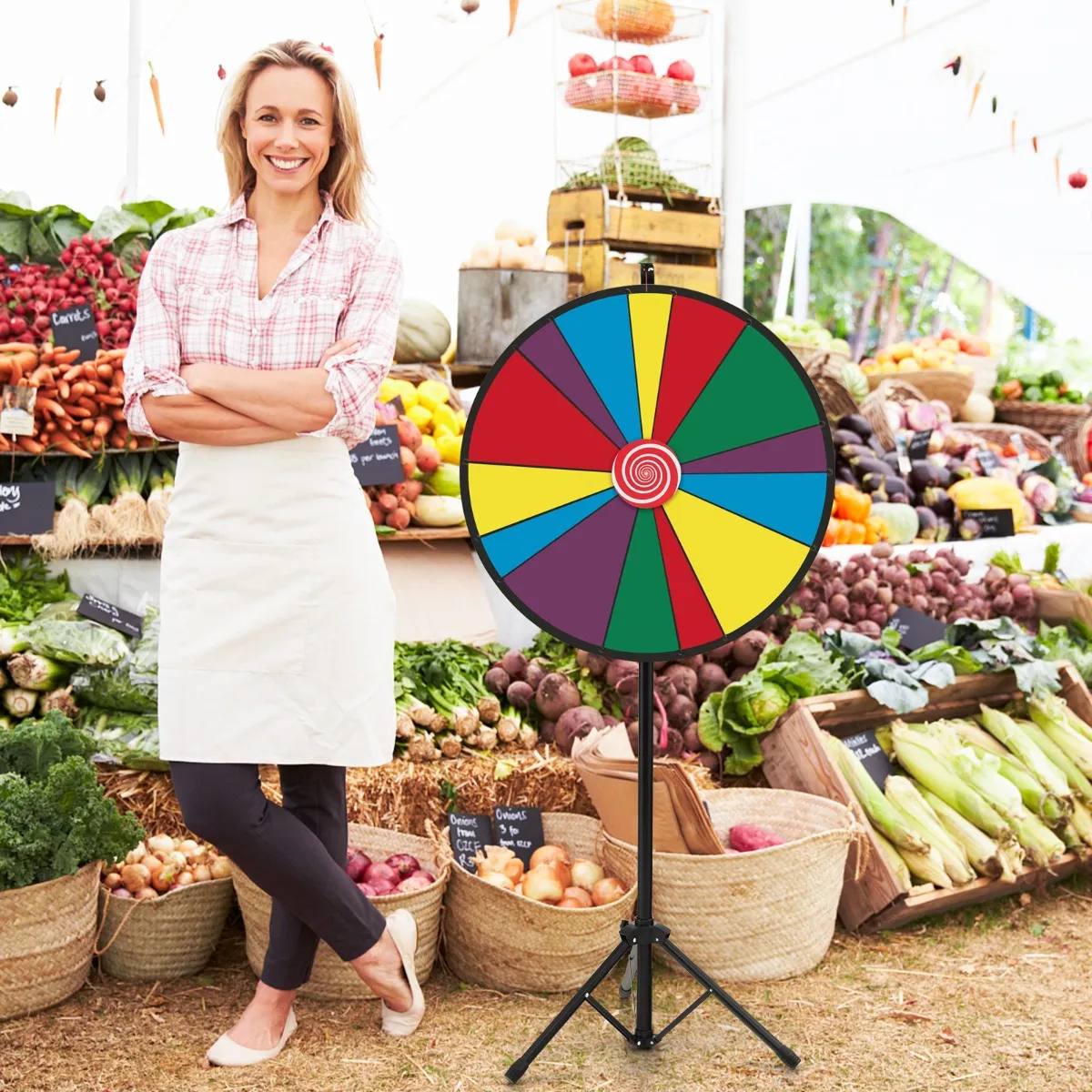 Ons prijzenwiel zal een ideale keuze zijn voor verschillende gelegenheden zoals familiebijeenkomsten, beurzen of tentoonstellingen. Dankzij de verstelbare hoogte kun je het op de meest geschikte hoogte instellen voor verschillende activiteiten. Uitgerust met een dry-erase marker en gum, kun je gemakkelijk tekst of afbeeldingen schrijven en uitwissen op het gladde oppervlak. Bovendien maken het topsysteem en de duurzame haringen een leuk klikkend geluid als het draait. En als je hem niet gebruikt, kun je hem moeiteloos losmaken en de metalen standaard opbergen in de draagtas.