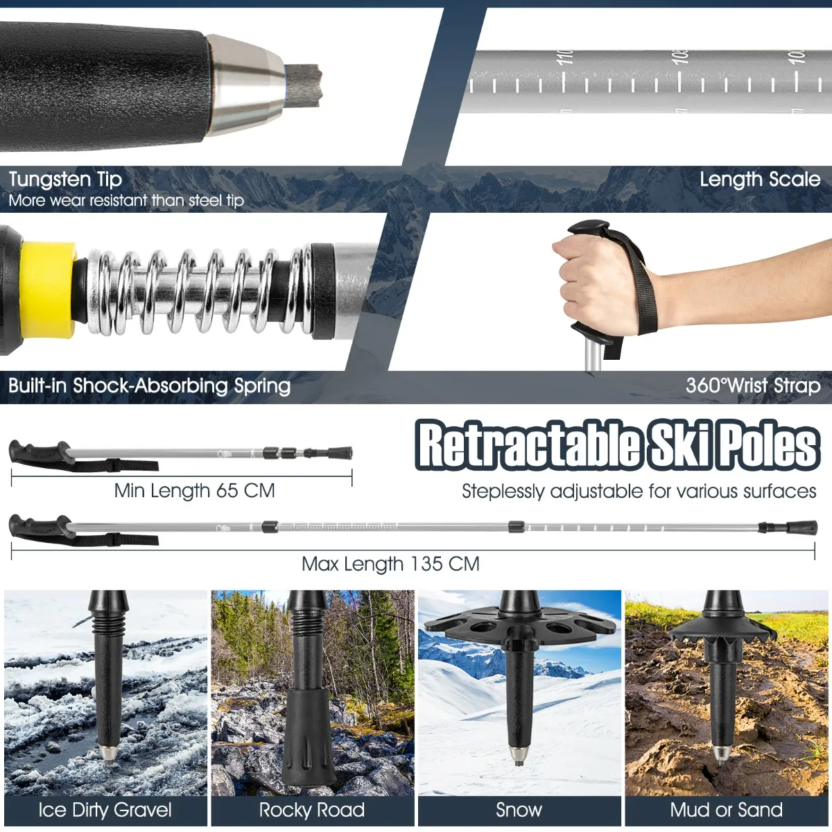 Inclusief skistokken, moddermanden, sneeuwmanden, opbergclip en draagtas