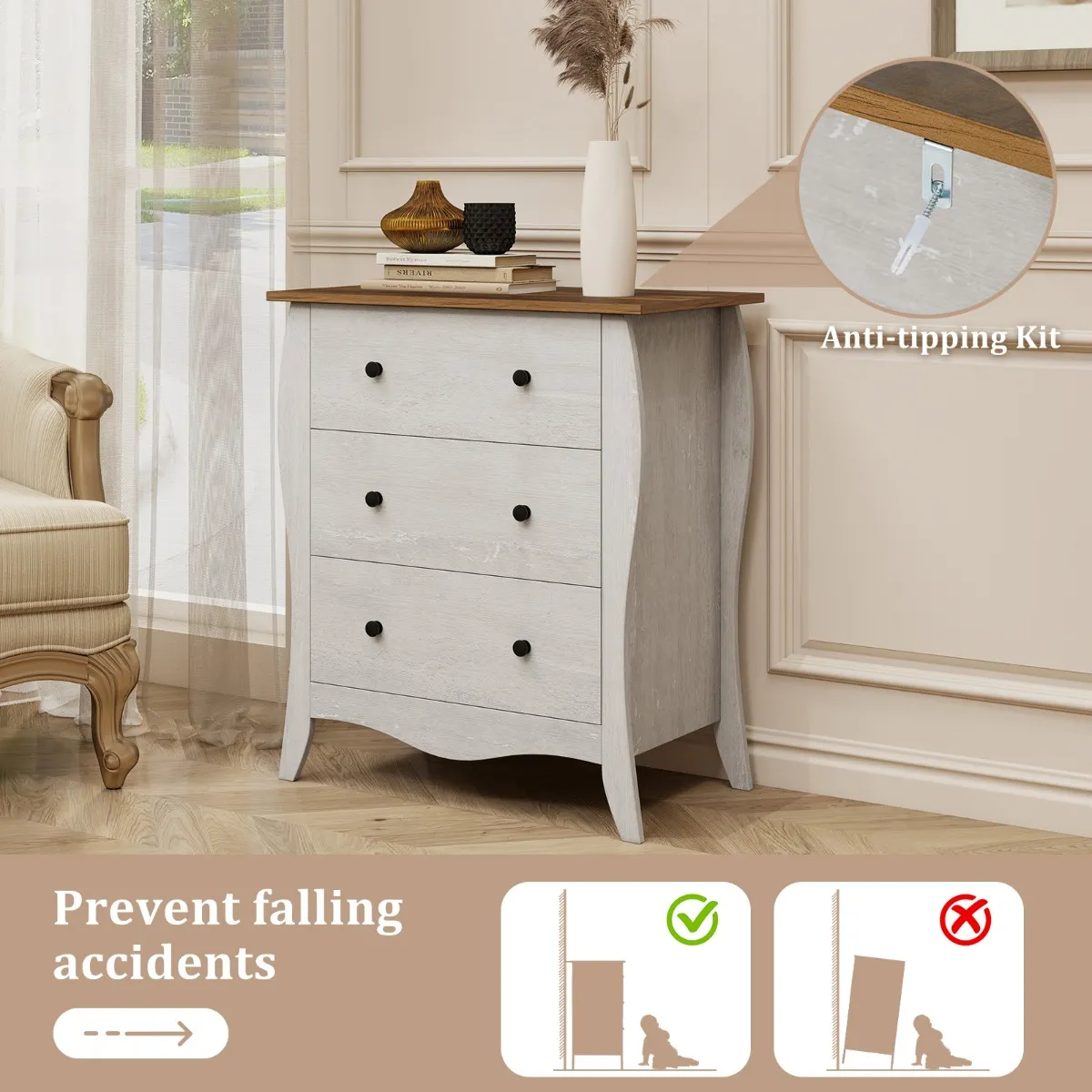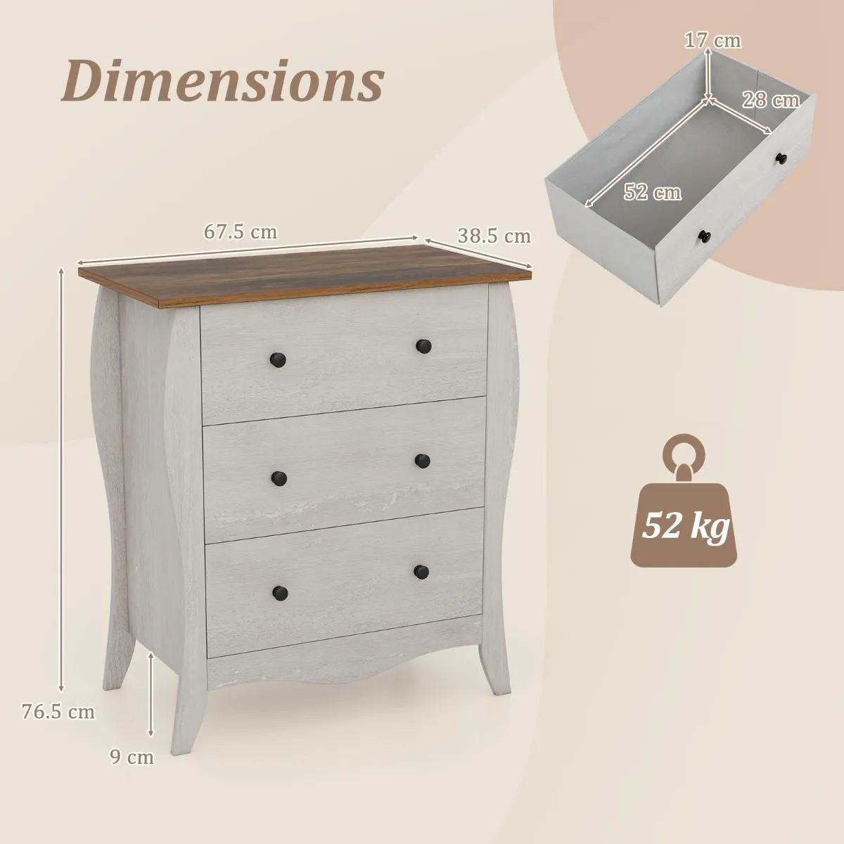 【De warmte van rustieke elegantie】: De ladekast met 3 laden heeft een gebogen silhouet en een houtnerf-afwerking voor een warme charme. Het is een meubelstuk dat de tijdloze aantrekkingskracht van een rustieke stijl in uw huis brengt, waardoor de kamer gastvrij en bewoond aanvoelt.